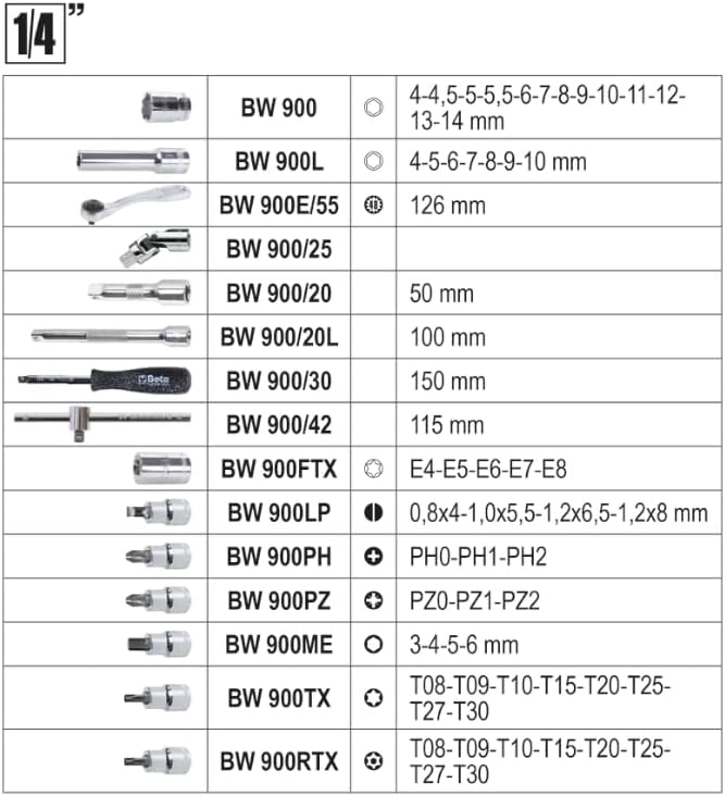 - Steckschlüssel mit 1/4"-Einsatz der Grössen 4 - 4,5 - 5 - 5,5 - 6 - 7 - 8 - 9 - 10 - 11 - 12 - 13 - 14 mm
