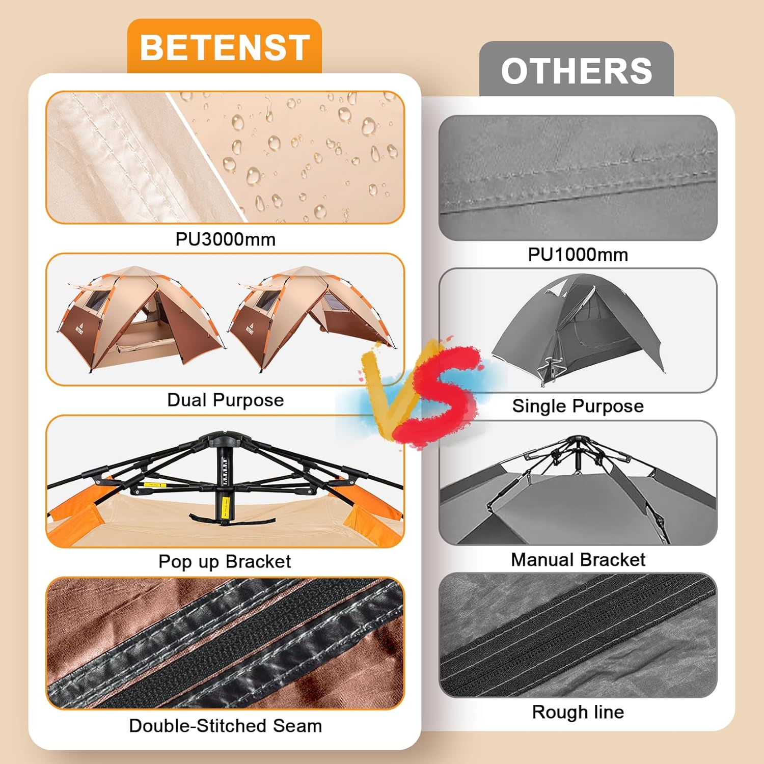 - 【Praktischer Stauraum】BETENST Familien-Campingzelt mit einer ausreichend grossen Apsis zum Verstauen von Gepäck, Ausrüstung und Schuhen. Dieses Pop-up-Zelt eignet sich für Freizeit-Camping, Ausruhen im Hinterhof, Festspiele,
