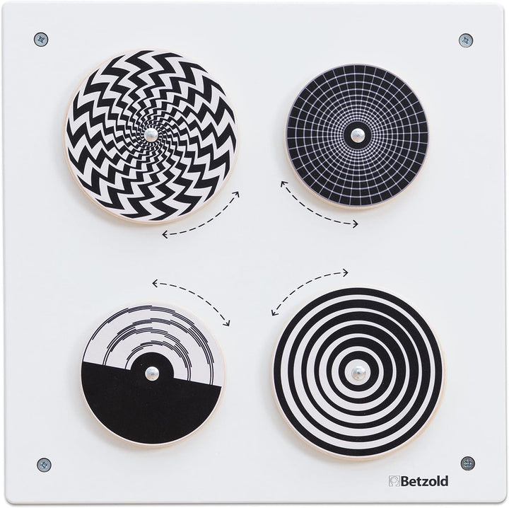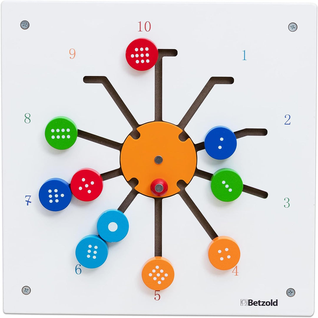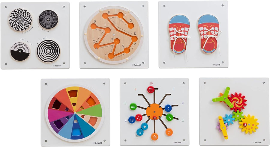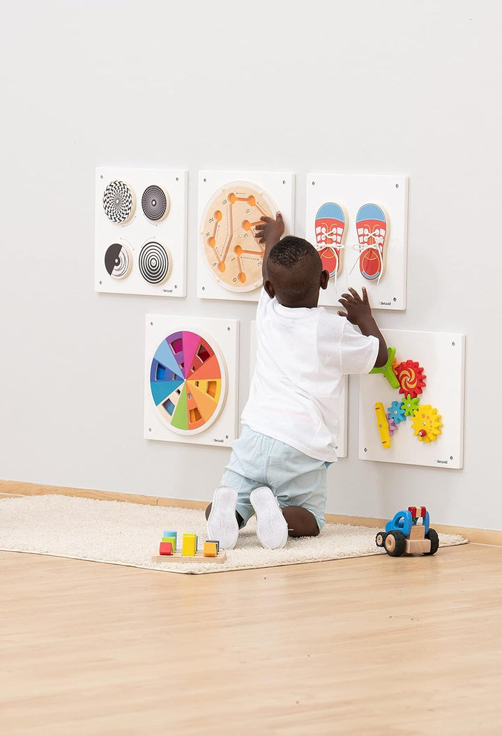 - BUNTE WANDSPIELE: In dem Set sind 6 verschiedene Wandelemente enthalten. Bei der Drehscheibe wird die Sinneswahrnehmung der Kinder gefördert. Ein weiteres Wandelement lässt die Kinder erste Erfahrungen mit der Mechanik machen, indem sie die Zahnräder