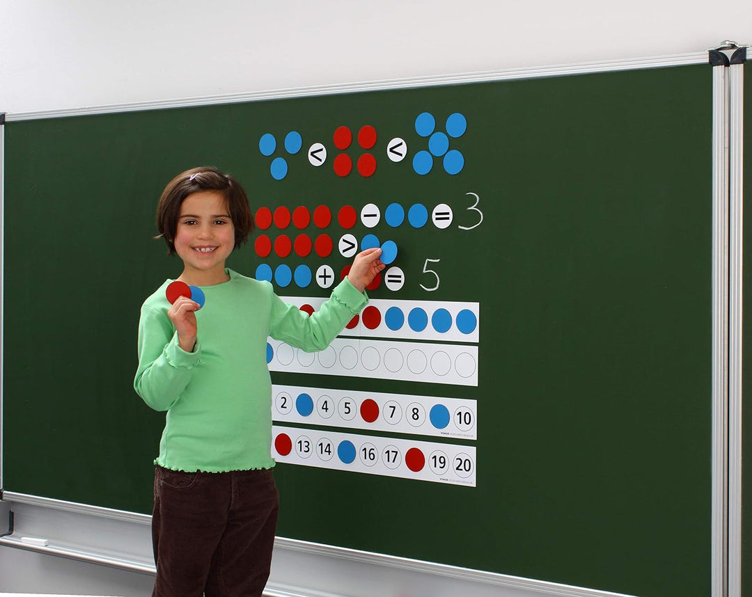 - DEMONSTRATIONS-MATERIAL FÜR DIE TAFEL: 100 Magnetische Wendeplättchen sowie Rechenzeichen und eine Rechenleiste für den Einsatz an der Tafel sind ebenso in dem grossen Set inklusive.