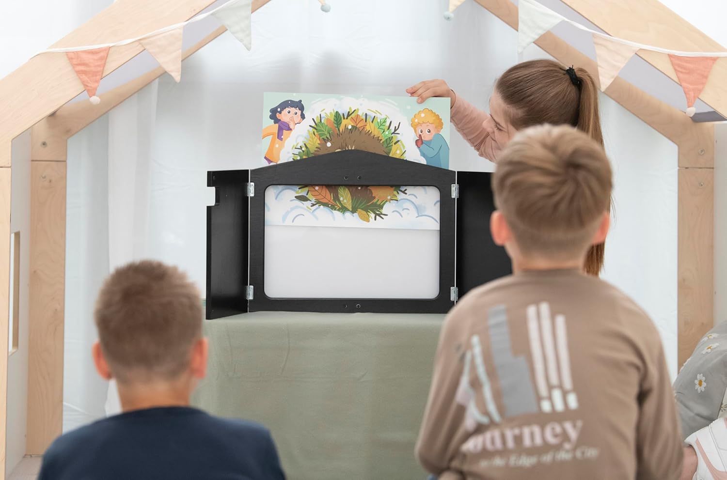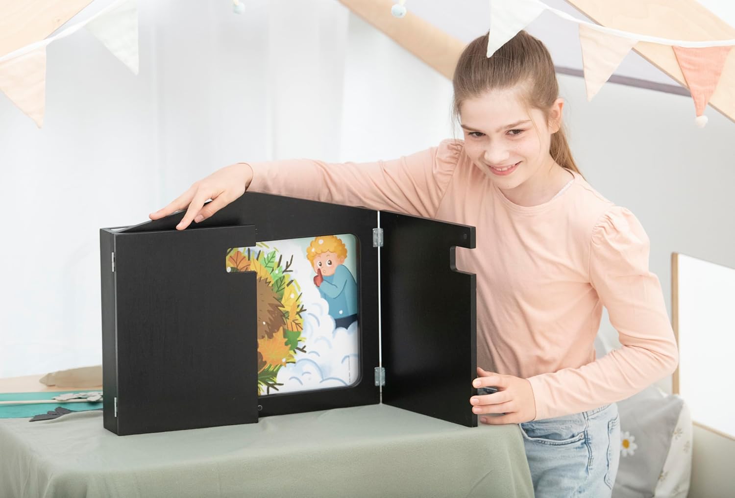 - ERZÄHL-, SCHATTEN- UND FIGURENTHEATER: Das Kombi-Kamishibai bietet drei Funktionen: Erzähltheater, Schattentheater und Figurentheater. Bildkarten, Acrylglasscheibe und Handpuppen machen es vielseitig.