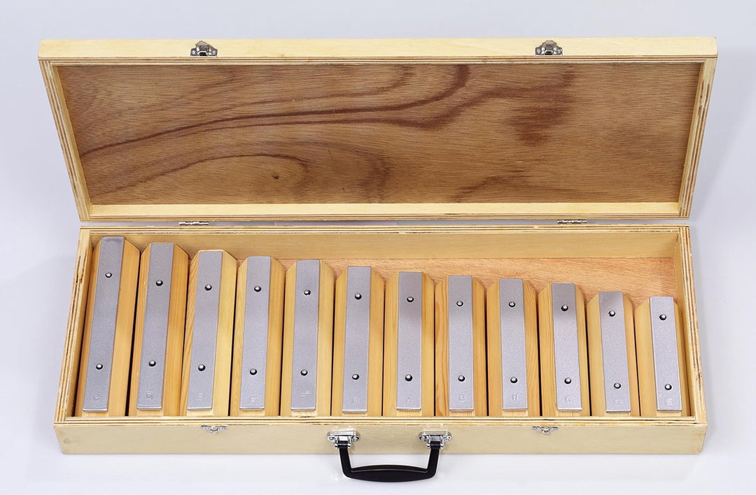 - KLANG-BAUSTEINE INKLUSIVE SCHLÄGELN: Die 12 Klangelemente sowie wie die 11 Kunststoffschlägel und der Holzschlägel kommen in einem praktischen Holzkoffer, für einen einfachen Transport.