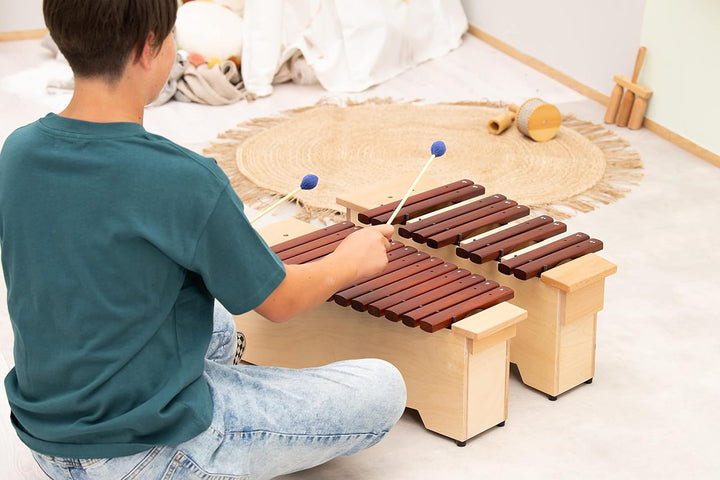 - HOCHWERTIG VERARBEITETES XYLOPHON: Der Mehrkammer-Korpus des Musikinstrumentes ist aus leichtem Ahornholz gefertigt. Er ist in 4 einzelne Resonanzkammern verschiedener Grösse aufgeteilt.