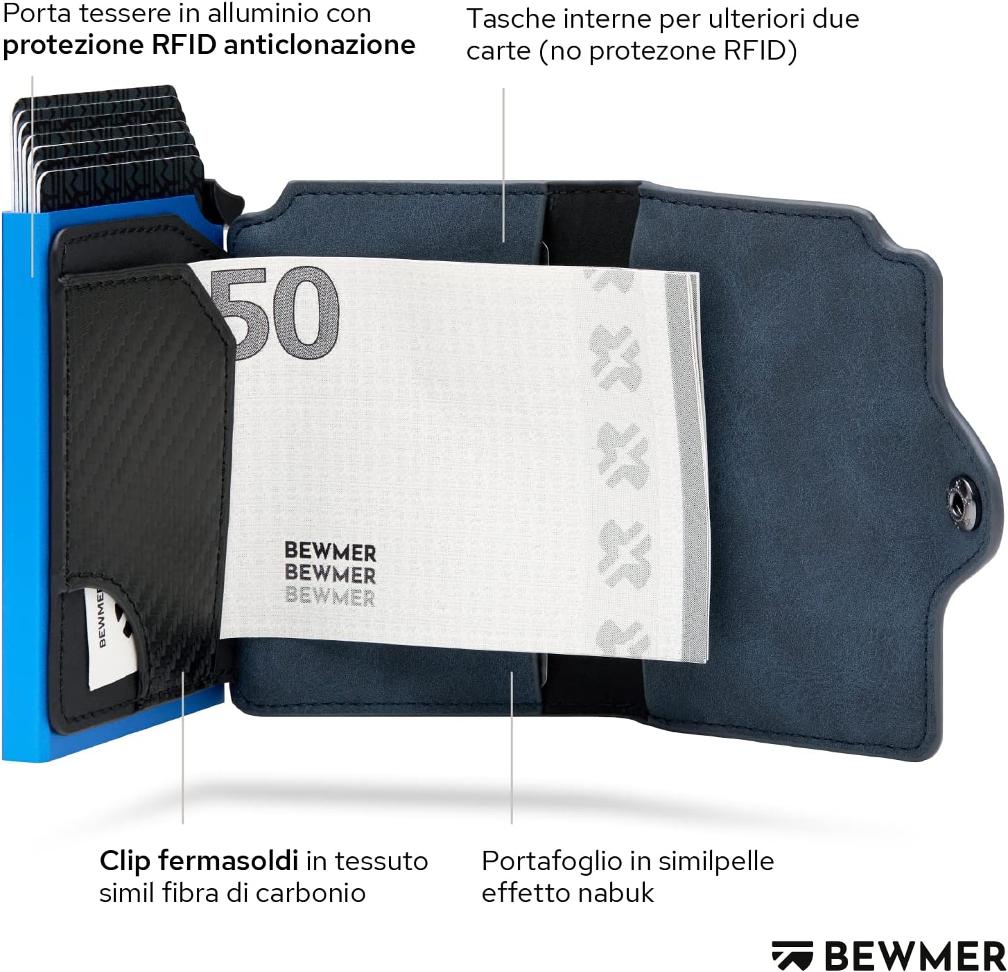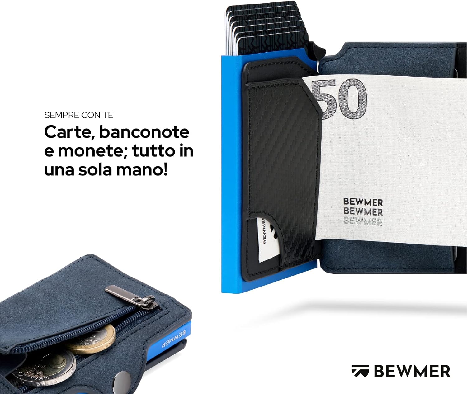 • [SLIM WALLET VOLLER ITALIENISCHER ELEGANZ] BEWMER ist das erste Smart&Slim Portemonnaie mit italienischem Design: Es fasst bis zu 9 Charge-, Debit- oder Kreditkarten (6/7 im Etui und 2 in den Innenfächern) und hat ein praktisches Fach mit einer