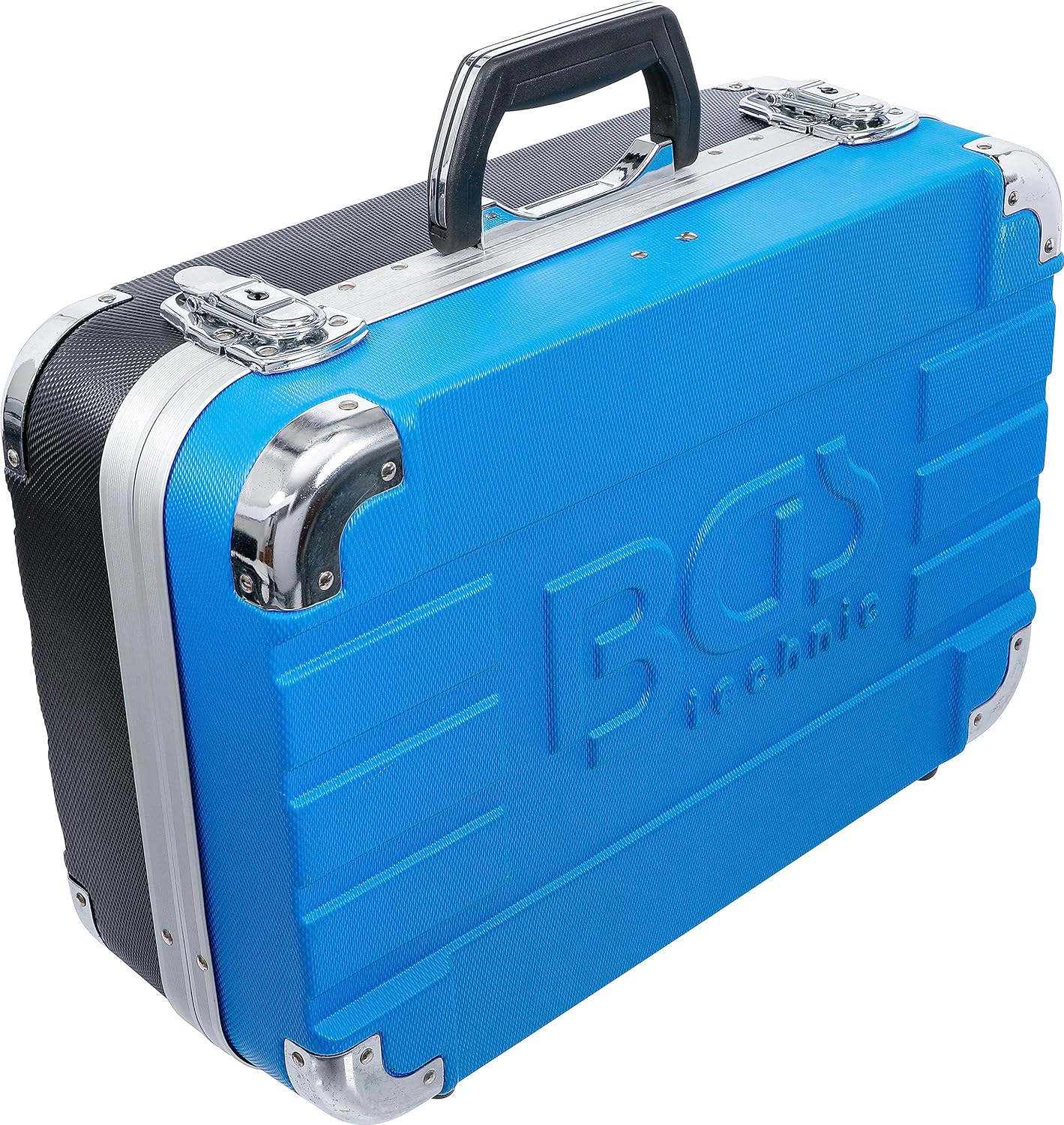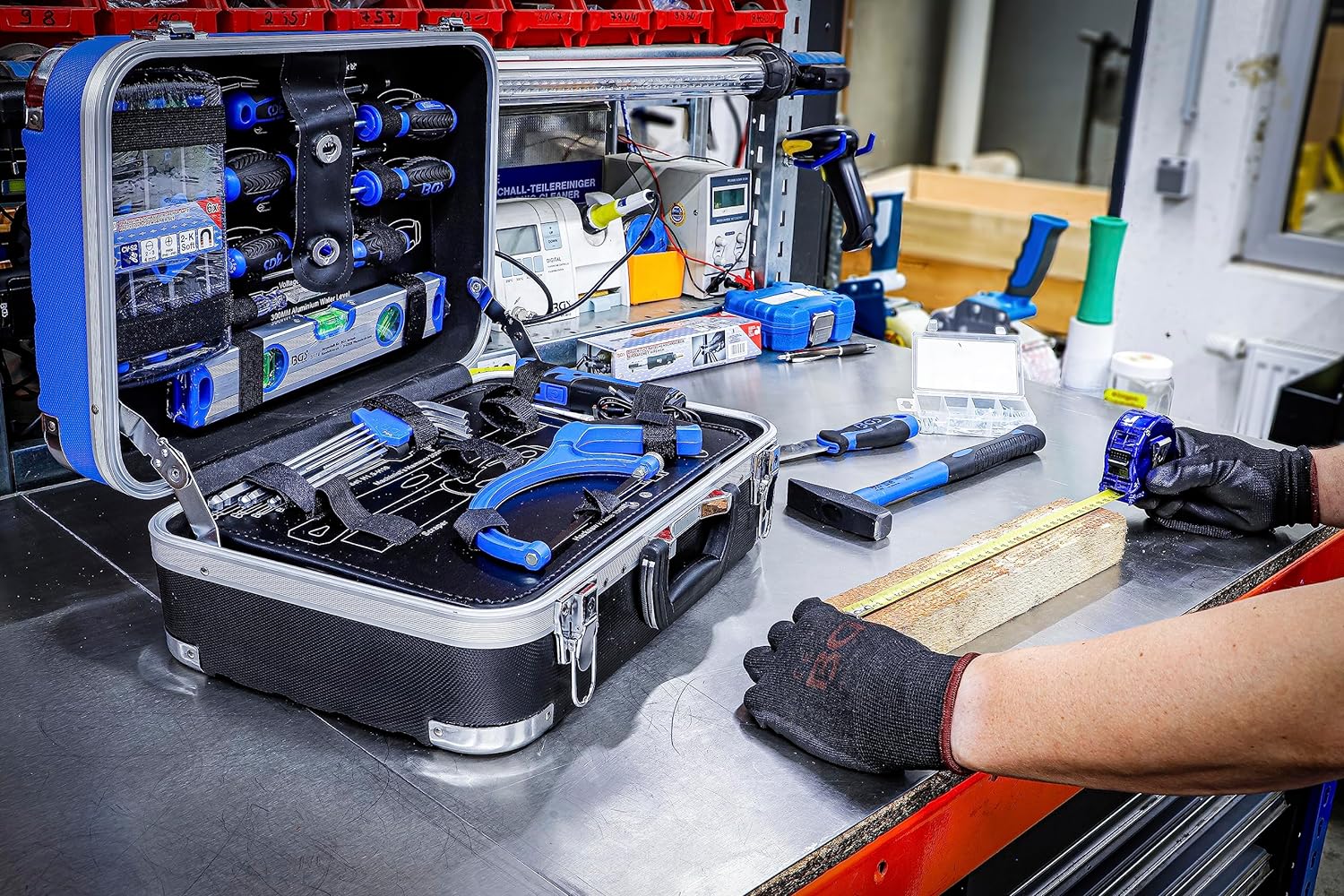 - eine EPE-Schaumeinlage aus robustem, hochwertigem Hartschaum verklebt im Bodenbereich bietet jedem Werkzeug seinen festen Platz | Steckschlüssel-Einsätze, Verlängerung, Umschaltknarre, Zangen und Maul-Ringschlüssel gefertigt aus Chrom-Vanadium-Stahl