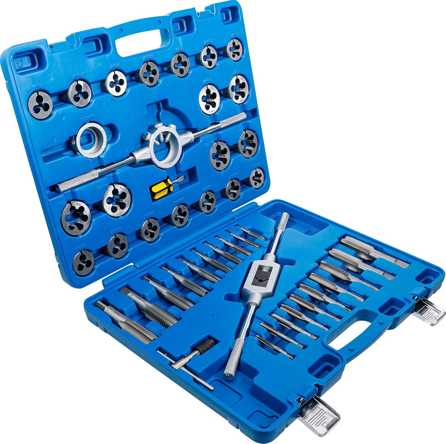 - 20 Gewindebohrer für Innengewinde, 20 Schneideisen für Aussengewinde (1x je Grösse):Feingewinde: 1/4" 28UNF - 5/16" 24UNF - 3/8" 24UNF - 7/16" 20UNF - 1/2" 20UNF - 9/16" 18UNF - 5/8" 18UNF - 3/4" 16UNF - 7/8" 14UNF - 1" 14UNF | Grobgewinde: 1/4" 20UNC