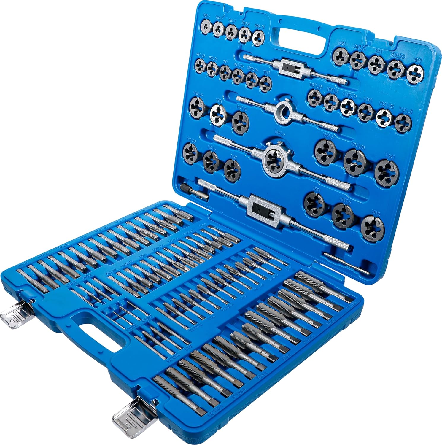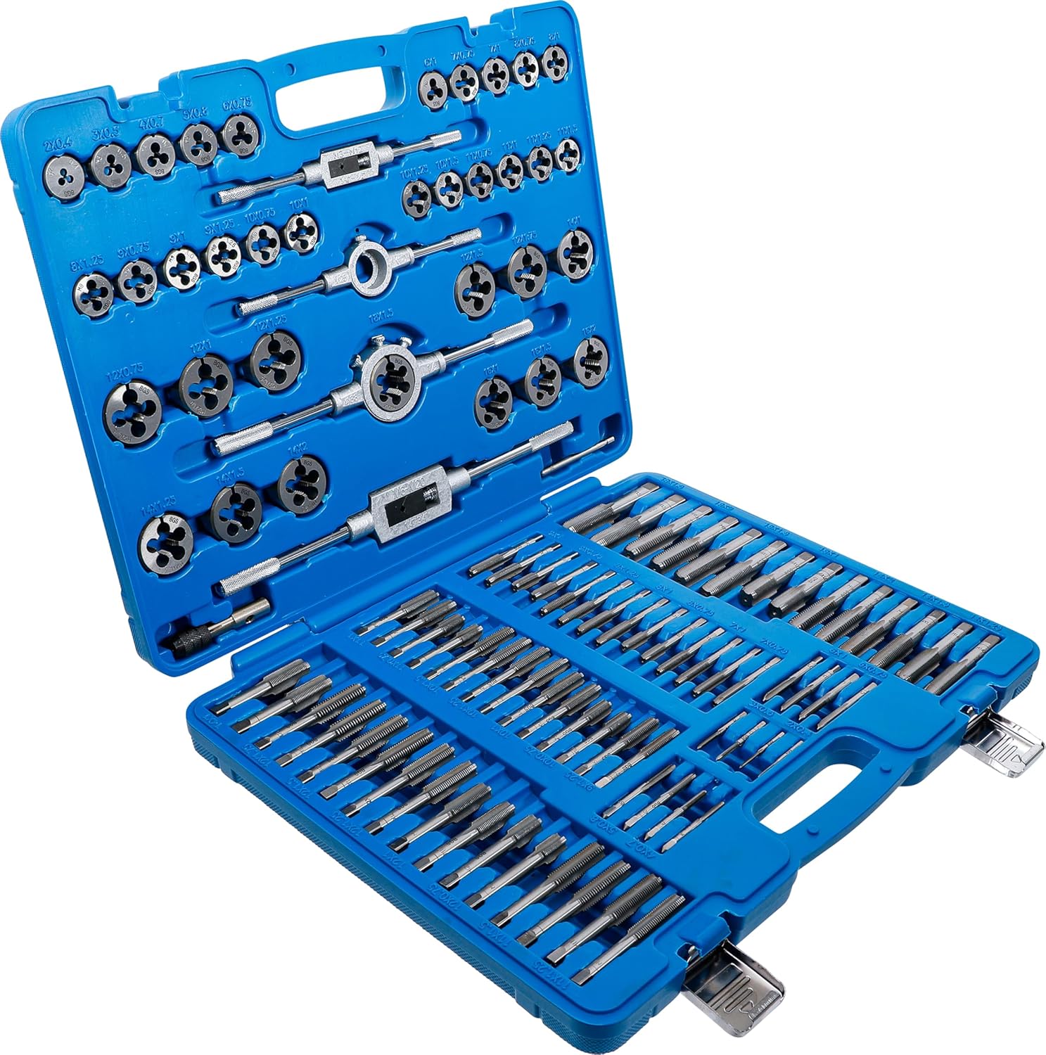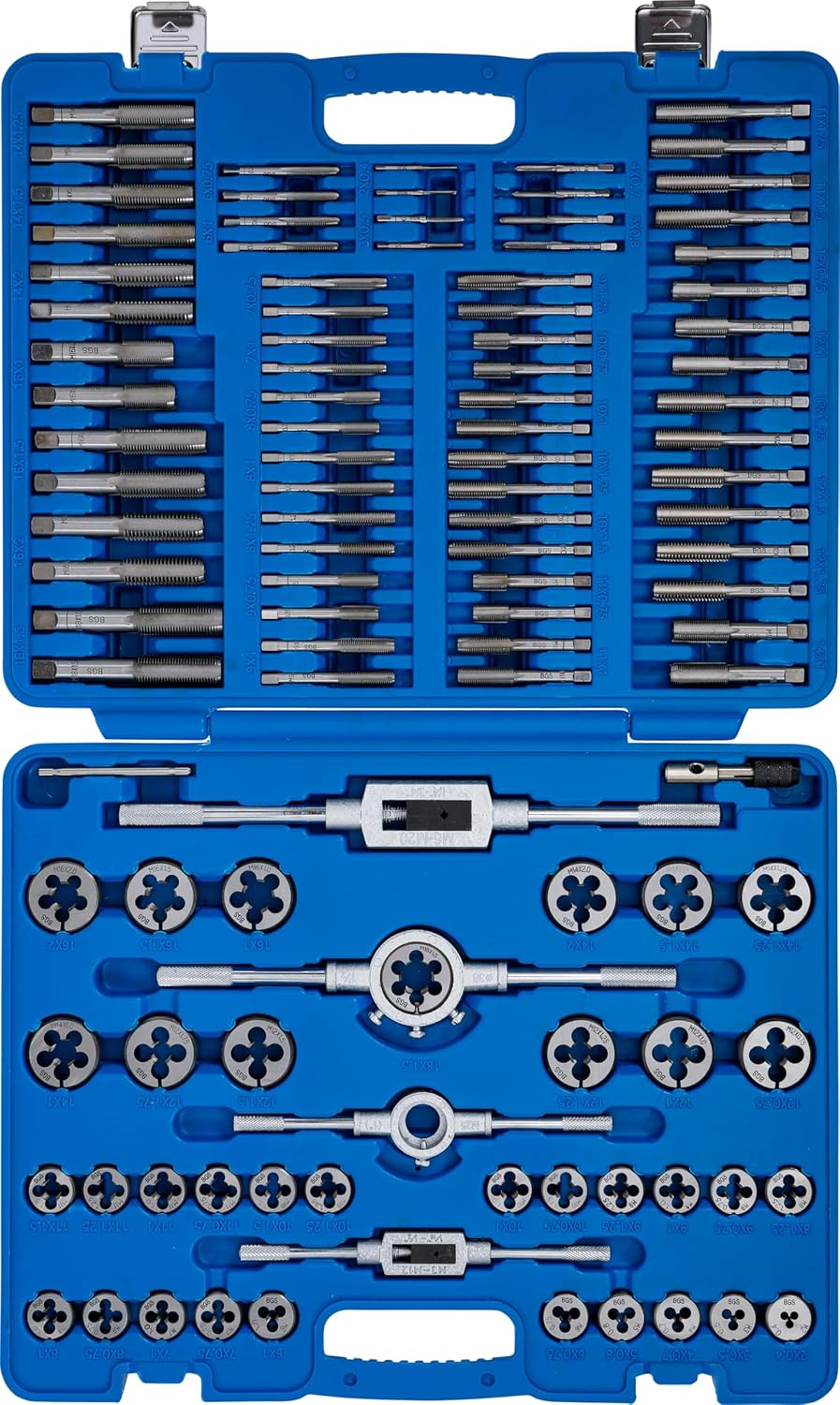 - 35 Gewindebohrer jeweils Vor-Hauptschneider, Nach-Fertigschneider und Schneideisen in folgenden Grössen und Steigungen: M2 x 0.4 - M3 x 0.5 - M4 x 0.7 - M5 x 0.8 - M6 x 1.0 - M6 x 0.75 - M7 x 1.0 - M7 x 0.75 - M8 x 0.75 - M8 x 1.0 - M8 x 1.25 - M9 x 0.75 - M9 x 1.0 - M9 x 1.25 - M10 x 0.75 - M10 x 1.0 - M10 x 1.25 - M10 x 1.5 - M11 x 0.75 - M11 x 1.0 - M11 x 1.25 - M11 x 1.5 - M12 x 0.75 - M12 x 1.0 - M12 x 1.25 - M12 x 1.5 - M12 x 1.75 - M14 x 1.0 - M14 x 1.25 - M14 x 1.5 - M14 x 2.0 - M16 x 1.0 - M16 x 1.5 - M16 x 2.0 - M18 x 1.5