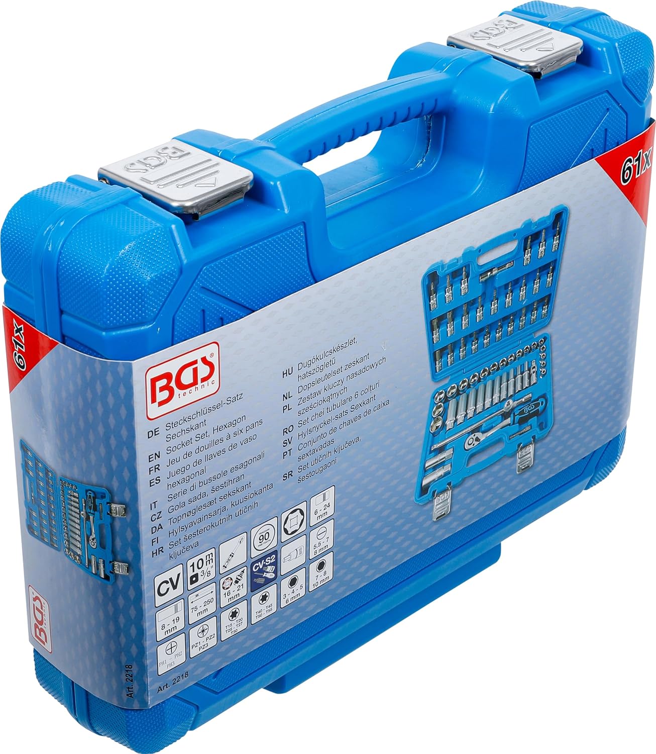- 18 Seckschlüssel-Einsätze, Sechskant: SW 6 - 7 - 8 - 9 - 10 - 11 - 12 - 13 - 14 - 15 - 16 - 17 - 18 - 19 - 20 - 21 - 22 - 24 mm | 10 Seckschlüssel-Einsätze, Sechskant, lang: SW 8 - 9 - 10 - 11 - 12 - 13 - 14 - 15 - 17 - 19 mm