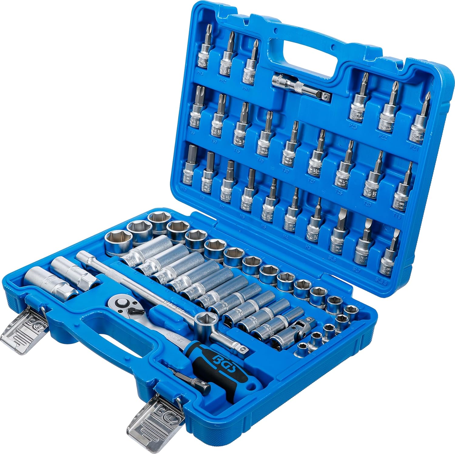 - Lieferumfang: Werkzeuge mit Antrieb 10 mm (3/8"): Knarre, feinverzahnt, 72 Zähne | Verlängerung, 75 mm | Gleitgriffadapter | Sechskant-Adapter 8 mm | Kardangelenk | Zündkerzen-Einsätze SW 16 + 21 mm