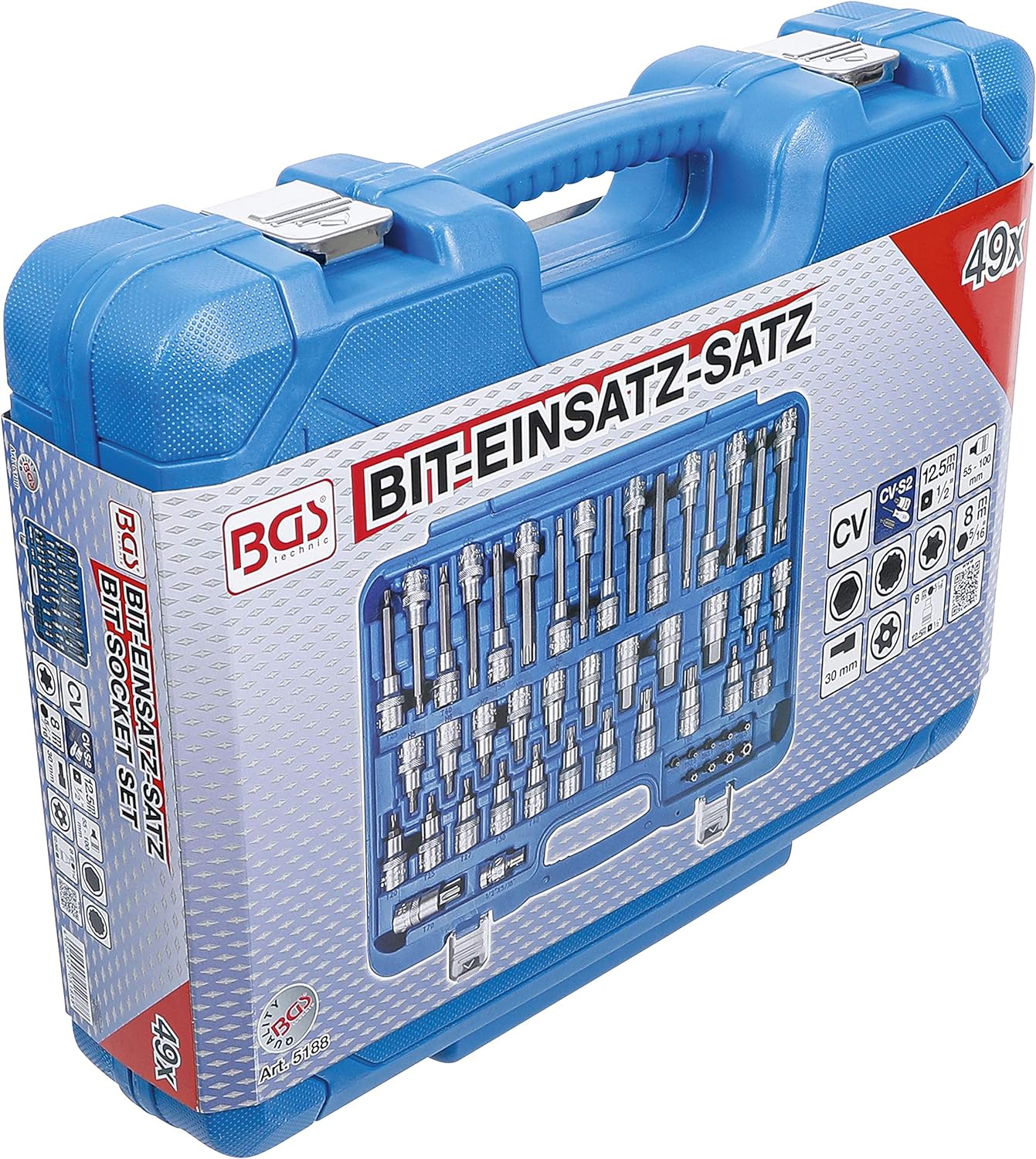 - 5 Bit-Einsätze, Länge 100 mm, Antrieb Innenvierkant 12,5 mm (1/2"), Abtrieb Innensechskant: 6 - 7 - 8 - 10 - 12 mm