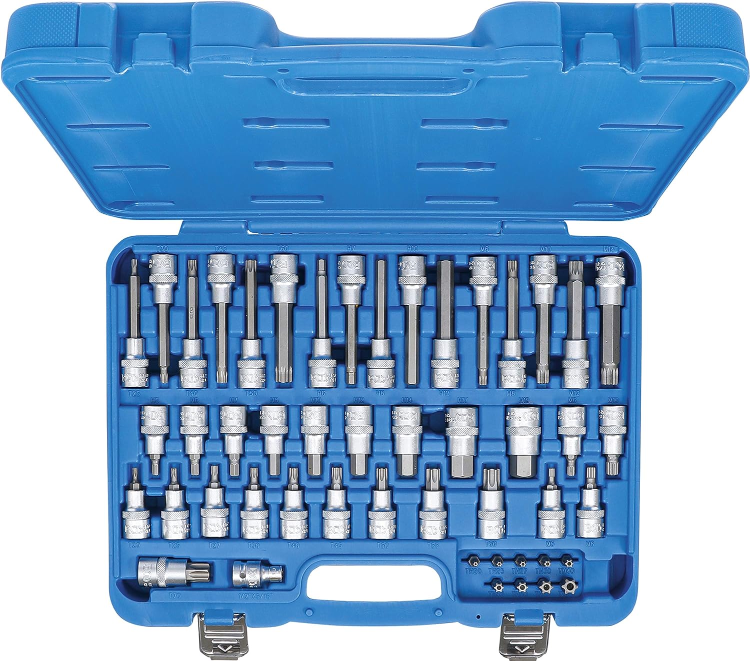 - 10 Bit-Einsätze, Länge 55 mm, Antrieb Innenvierkant 12,5 mm (1/2"), Abtrieb T-Profil (für Torx): T20 - T25 - T27 - T30 - T40 - T45 - T50 - T55 - T60 - T70