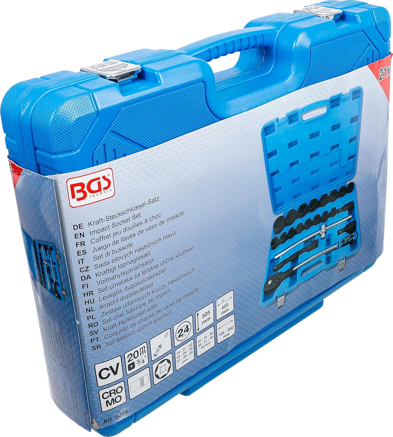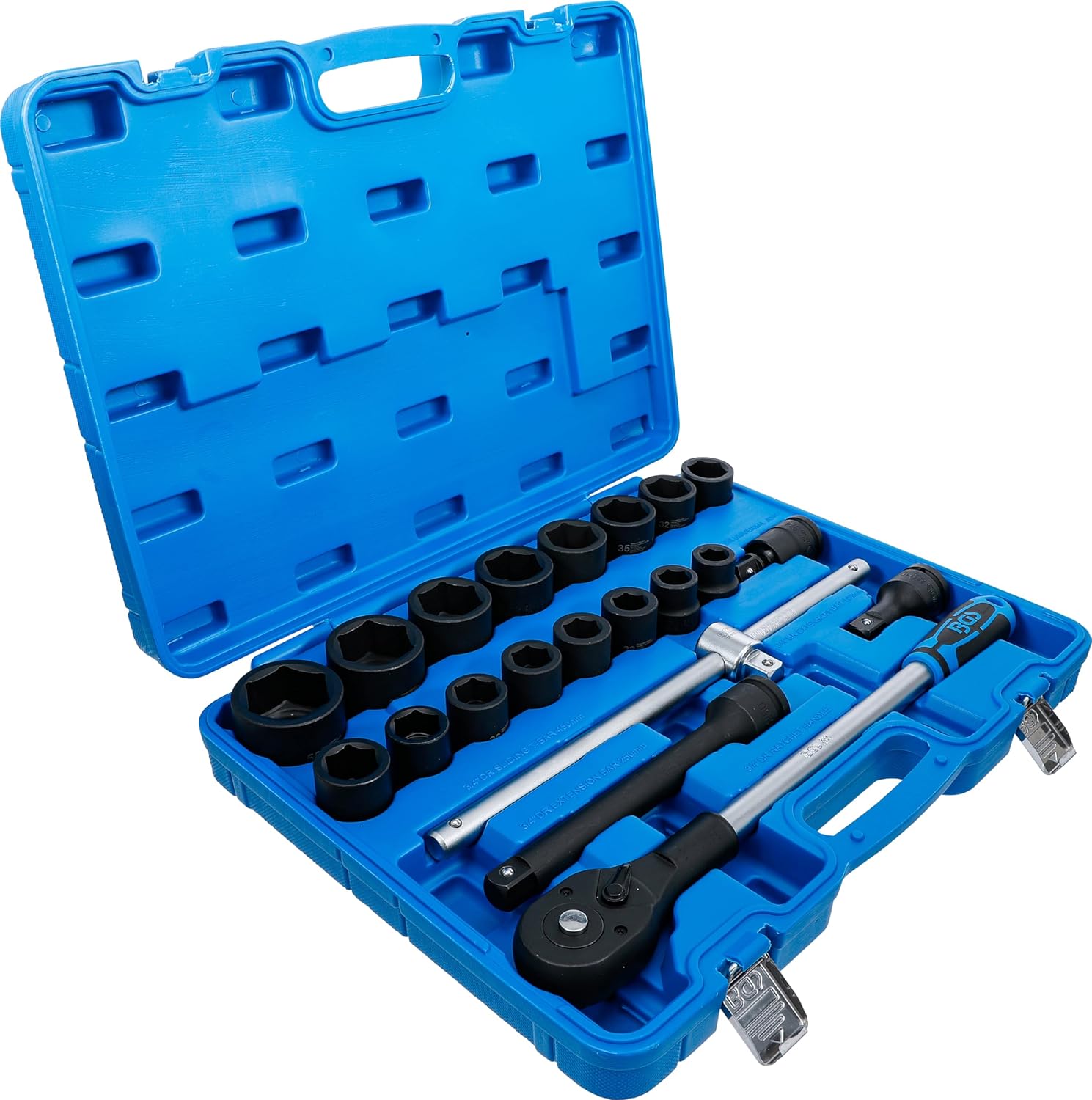 - Lieferumfang: Gleitgriff 450 mm lang | Umschaltknarre mit Einsatz-Schnelllöser, Länge 505 mm | Verlängerungen in 105 mm und 250 mm | Kardangelenk 105 mm | Kraft-Steckschlüssel-Einsätze, Sechskant, Antrieb Innenvierkant 20 mm (3/4"): SW 19 - 21 - 22 - 23 - 24 - 26 - 27 - 29 - 30 - 32 - 35 - 36 - 38 - 41 - 46 - 50 mm