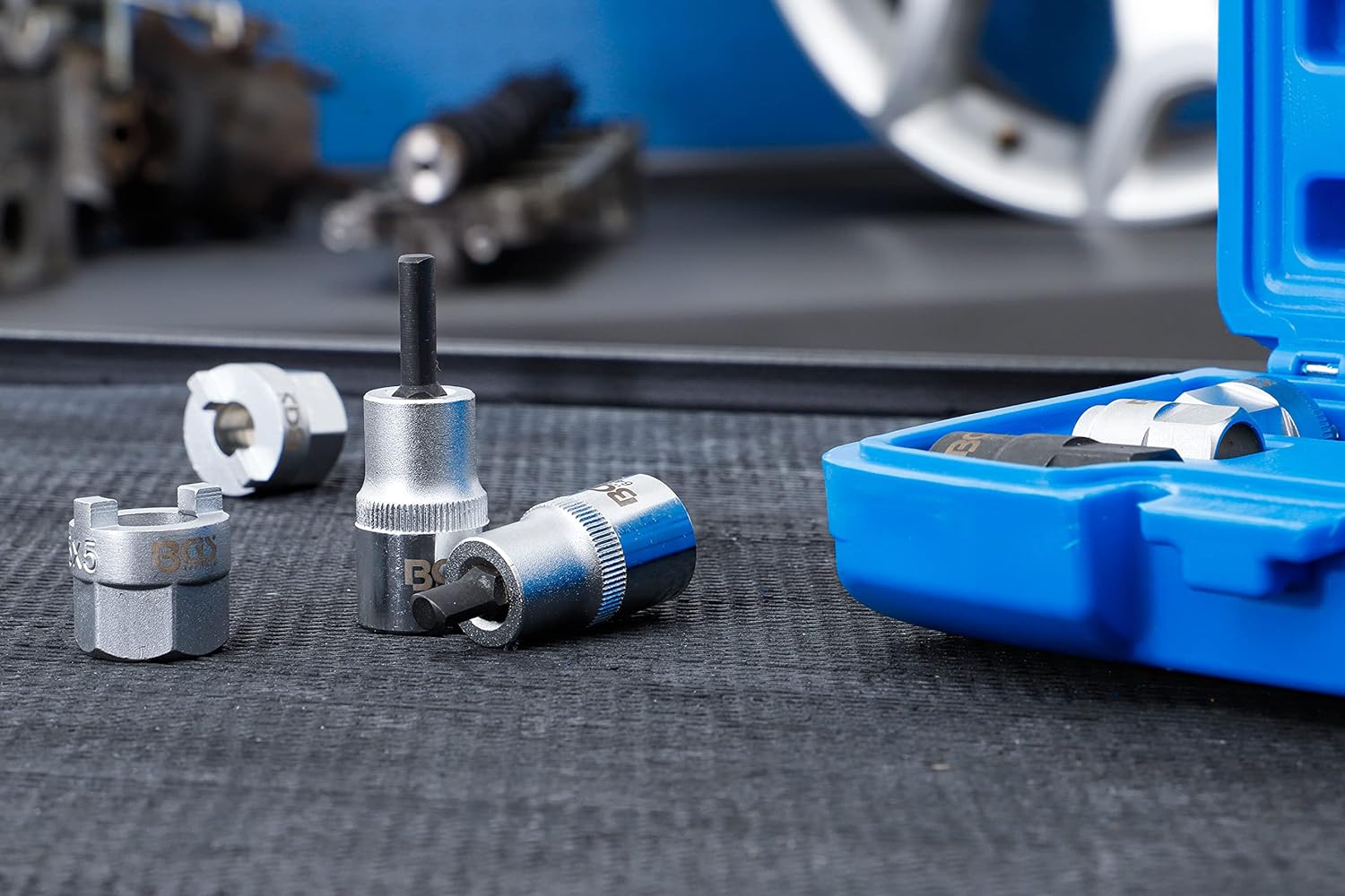 - folgende Spezialeinsätze für obere Stossdämpfermuttern: Innen- 10,5 mm, 3,5 mm Zapfen, 22 mm Sechskant-Antrieb | Innen- 12,5 mm, 3,5 mm Zapfen, 22 mm Sechskant-Antrieb | Innen- 14,5 mm, 5,0 mm Zapfen, 22 mm Sechskant-Antrieb | Innen- 14,0 mm, 2,5 mm