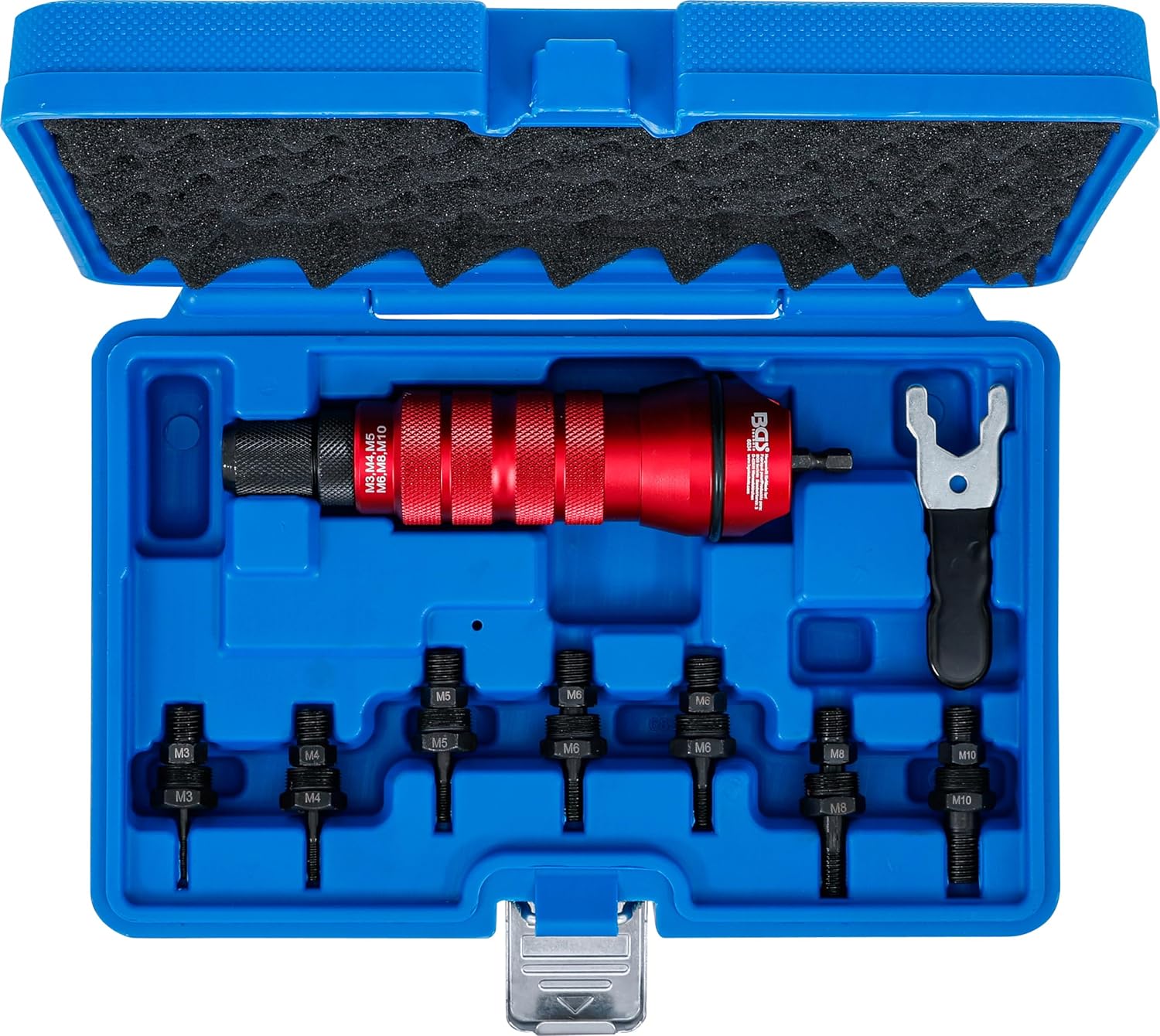 - Lieferumfang: 1 Nietmutternaufsatz, Antrieb Aussensechskant 6,3 mm (1/4") | 1 Nietmutternzugdorn, M3 | 1 Nietmutternzugdorn, M4 | 1 Nietmutternzugdorn, M5 | 1 Nietmutternzugdorn, M6 | 1 Nietmutternzugdorn, M8 | 1 Nietmutternzugdorn, M10