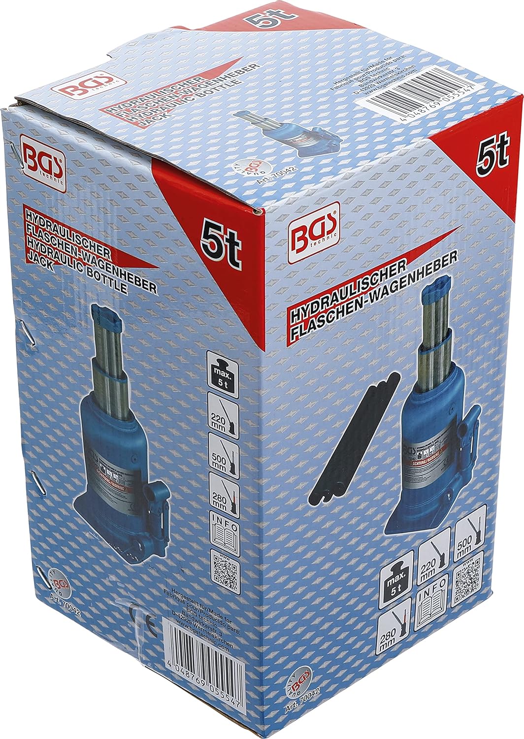 - Tragfähigkeit max.: 5 t | Hubhöhe: 280 mm | Höhe min.: 220 mm | Höhe max.: 500 mm | Stempeldurchmesser: 45 / 32 mm | Durchmesser Aufnahmeteller: 41 mm | Abmessungen Fussplatte (B x T): 135 x 130 mm | Griff Gesamtlänge: 580 mm | Griff (Durchmesser x