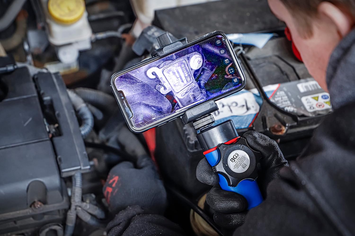 - geeignet für Geräte mit Android und iOS Betriebssystemen| Livebild wird via WLAN direkt auf das mobile Endgerät übertragen| inkl. Smartphone Halterung für das Endgerät| stufenlos schwenkbare, halbstarre Kamerasonde (180° seitlich schwenkbar)| mit