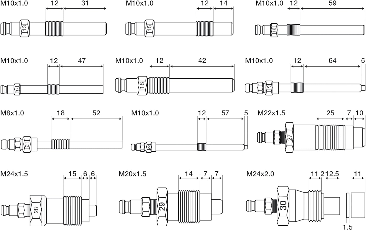 - Glühkerzenadapter für folgende Hersteller: Alfa, BMW, Chrysler, Daewoo, Fiat, Ford, Hyundai, Isuzu, Land Rover, Mazda, Mercedes-Benz, Mitsubishi, Nissan, Opel, PSA, Renault, Saab, Suzuki, Toyota, VAG, Vauxhall und Volvo