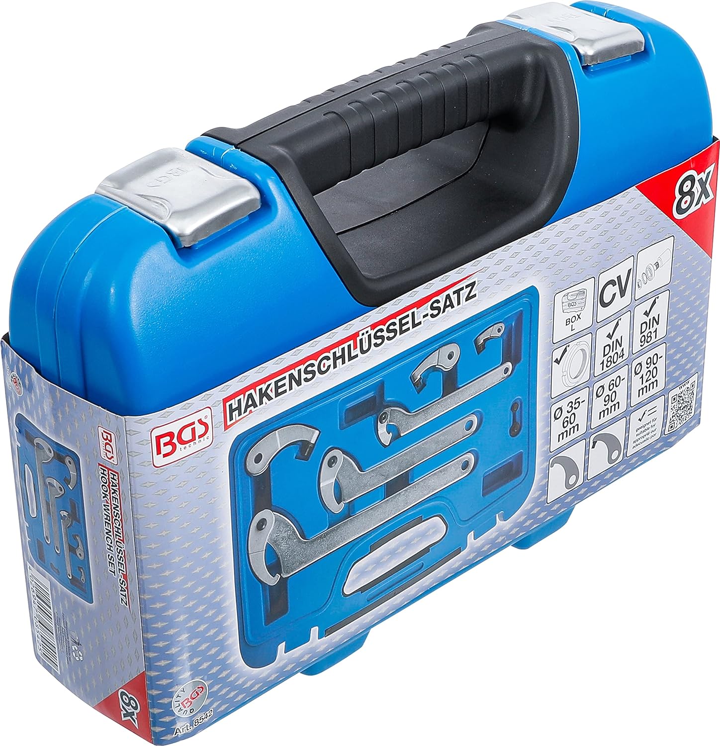 - Lieferumfang: 1 Gelenk-Hakenschlüssel mit Nase, 35 - 60 mm | 1 Gelenk-Hakenschlüssel mit Nase, 60 - 90 mm | 1 Gelenk-Hakenschlüssel mit Nase, 90 - 120 mm | 1 Haken mit Zapfen, auswechselbar Ø 4 mm M5 x 0.8 | 1 Haken mit Zapfen, auswechselbar Ø 5 mm