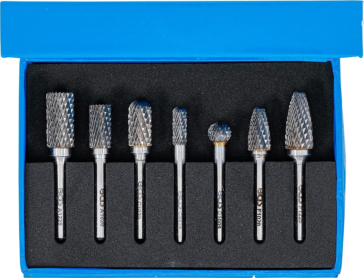 - beinhaltet folgende Fräsköpfe: 1 Kugelfräser, 2 Kegelfräser, 2 Fräser zylindrisch, 2 Fräser zylindrisch mit Kugelkopf