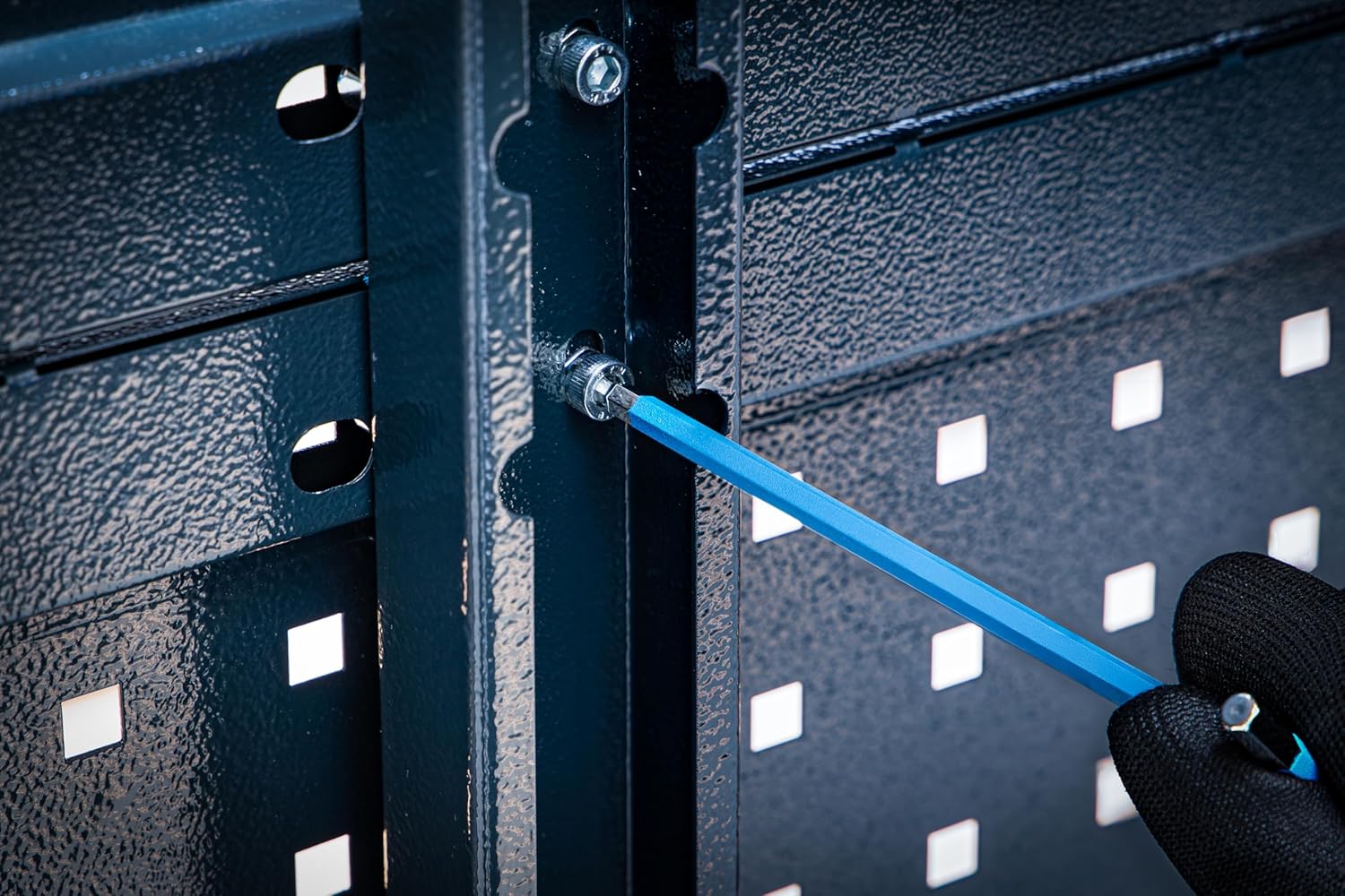 - Einsätze in "Super Lock" (Wellenprofil) Ausführung | Antrieb 6,3 mm (1/4") und 12,5 mm (1/2") | 3 feinverzahnte Umschaltknarren, 72 Zähne | Winkelschlüssel-Satz, extra lang, Innensechskant/Innensechskant mit Kugelkopf im Klapphalter: 1,5 mm - 2 mm