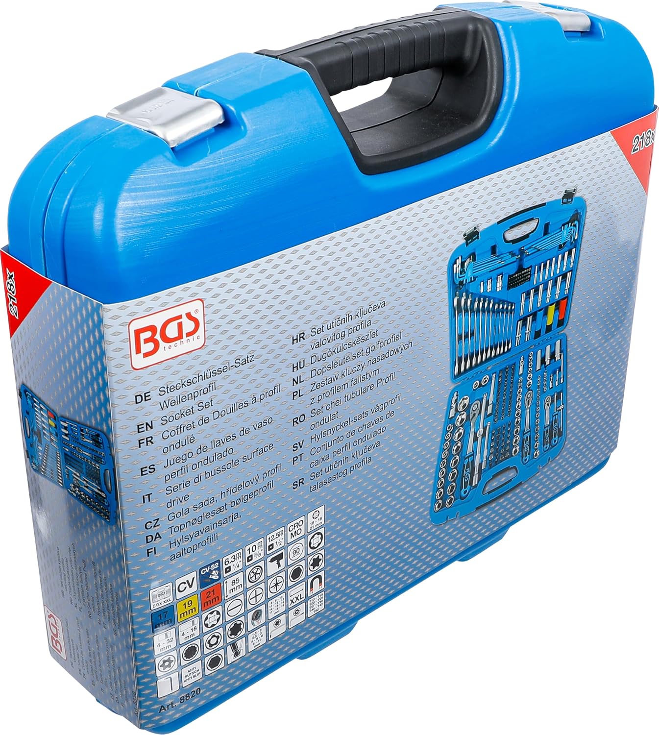 - Werkzeuge mit 10 mm (3/8") Antrieb: 1 Umschaltknarre | 10 Steckschlüssel-Einsätze SW 10 - 11 - 12 - 13 - 14 - 15 - 16 - 17 - 18 - 19 mm | 6 Steckschlüssel-Einsätze, tief, SW 10 - 11 - 12 - 13 - 14 - 15 mm | 6 Steckschlüssel-Einsätze E-Profil SW E10