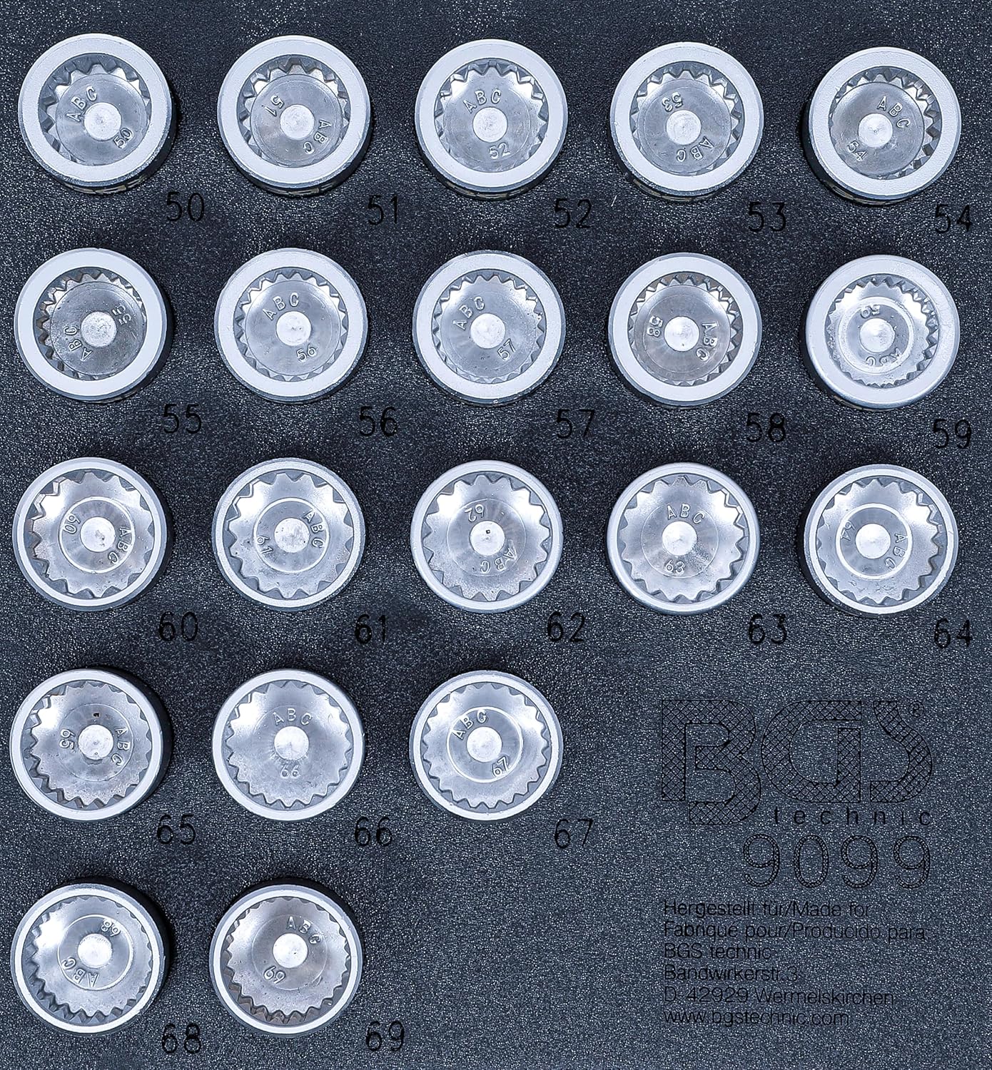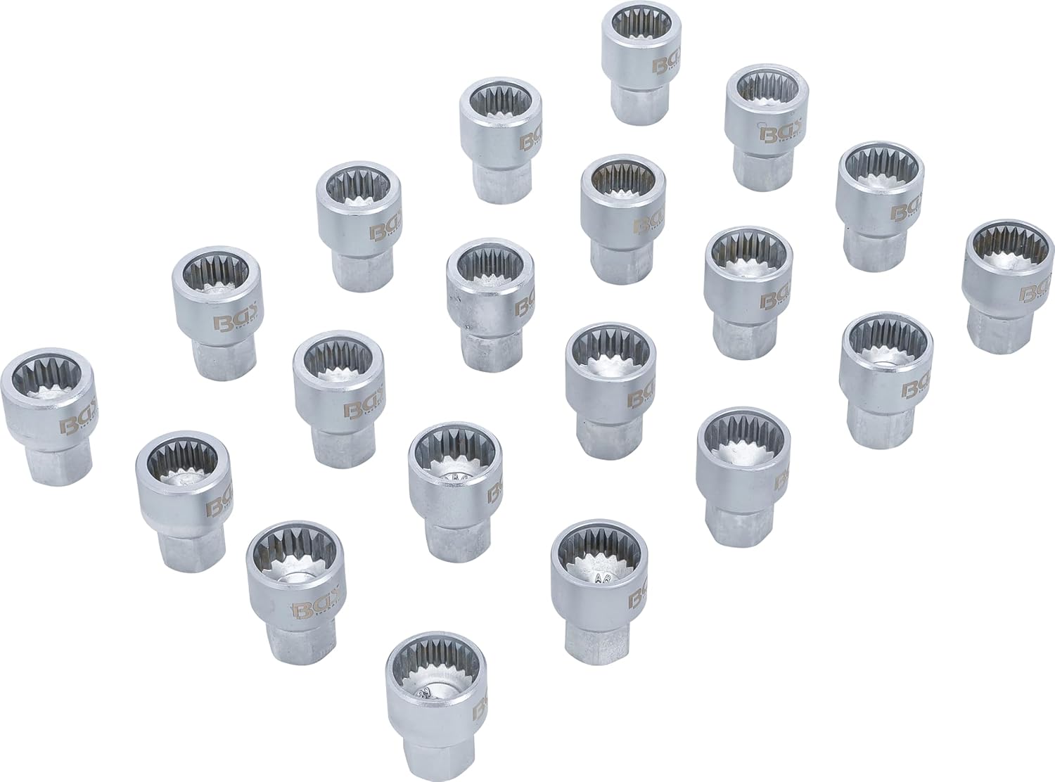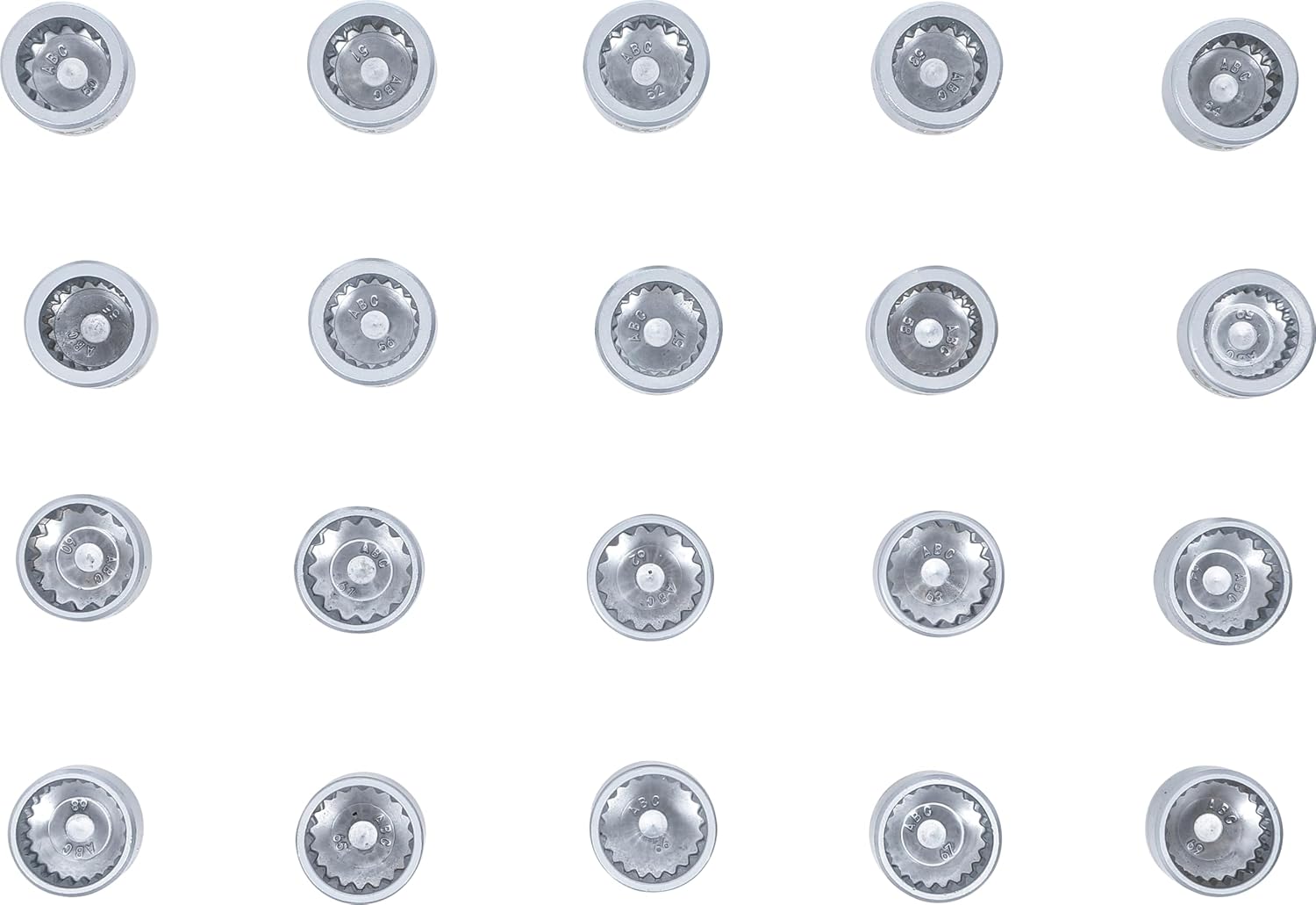 - 20x Felgenschlosseinsätze in den Grössen: #50x14-kant - #51x15-kant - #52x16-kant - #53x17-kant - #53x18-kant - #55x19-kant - #56x20-kant - #57x21-kant - #58x22-kant - #59x23-kant - #60x14-kant - #61x15-kant - #62x16-kant - #63x17-kant - #64x18-kant -