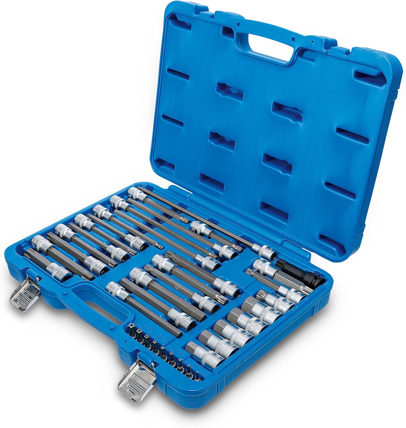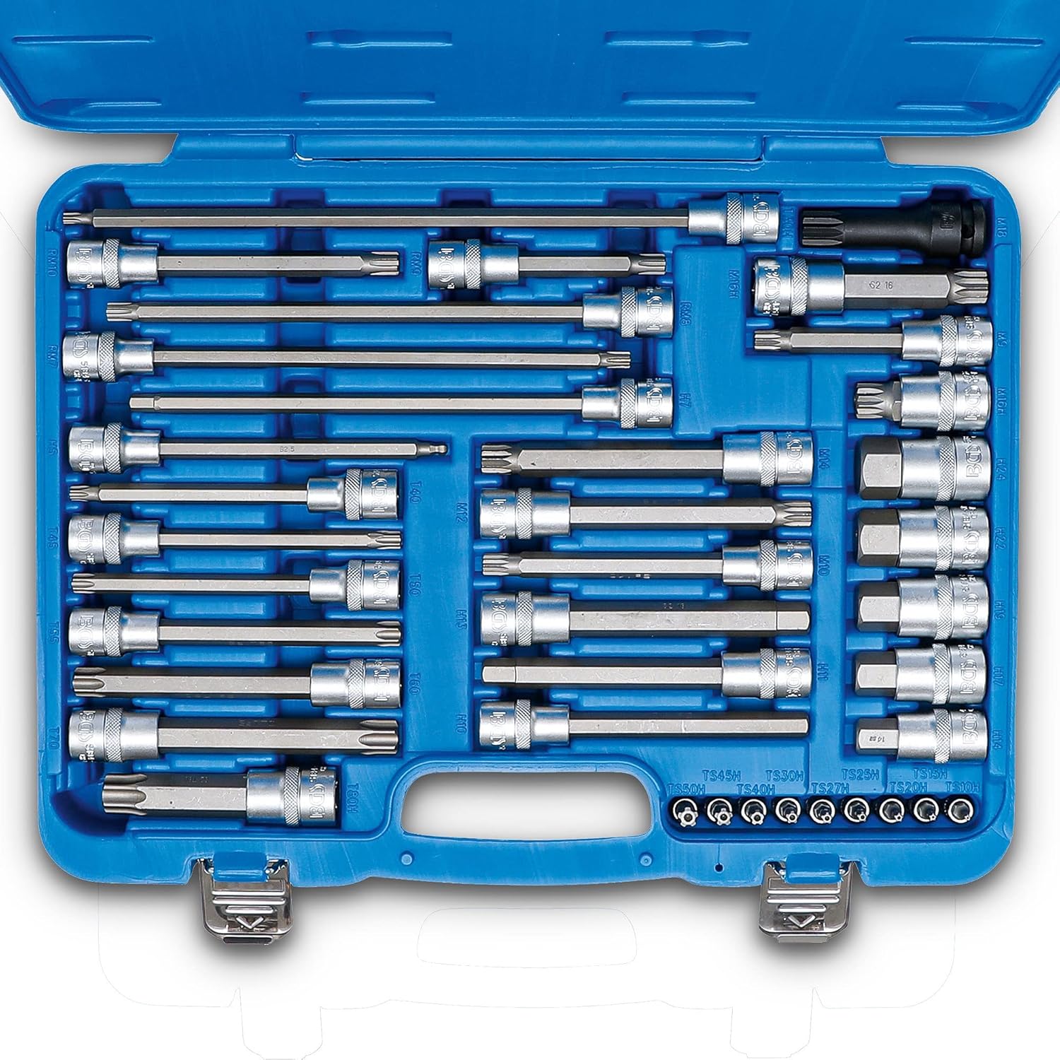 - 6 Bit-Einsätze, Antrieb Innenvierkant 12,5 mm (1/2"), Abtrieb Innenvielzahn (für XZN): M9 x 100 mm - M10 x 140 mm - M12 x 140 mm - M14 x 140 mm - M16 x 100 mm (mit Bohrung) - M16 x 55 mm (mit Bohrung)