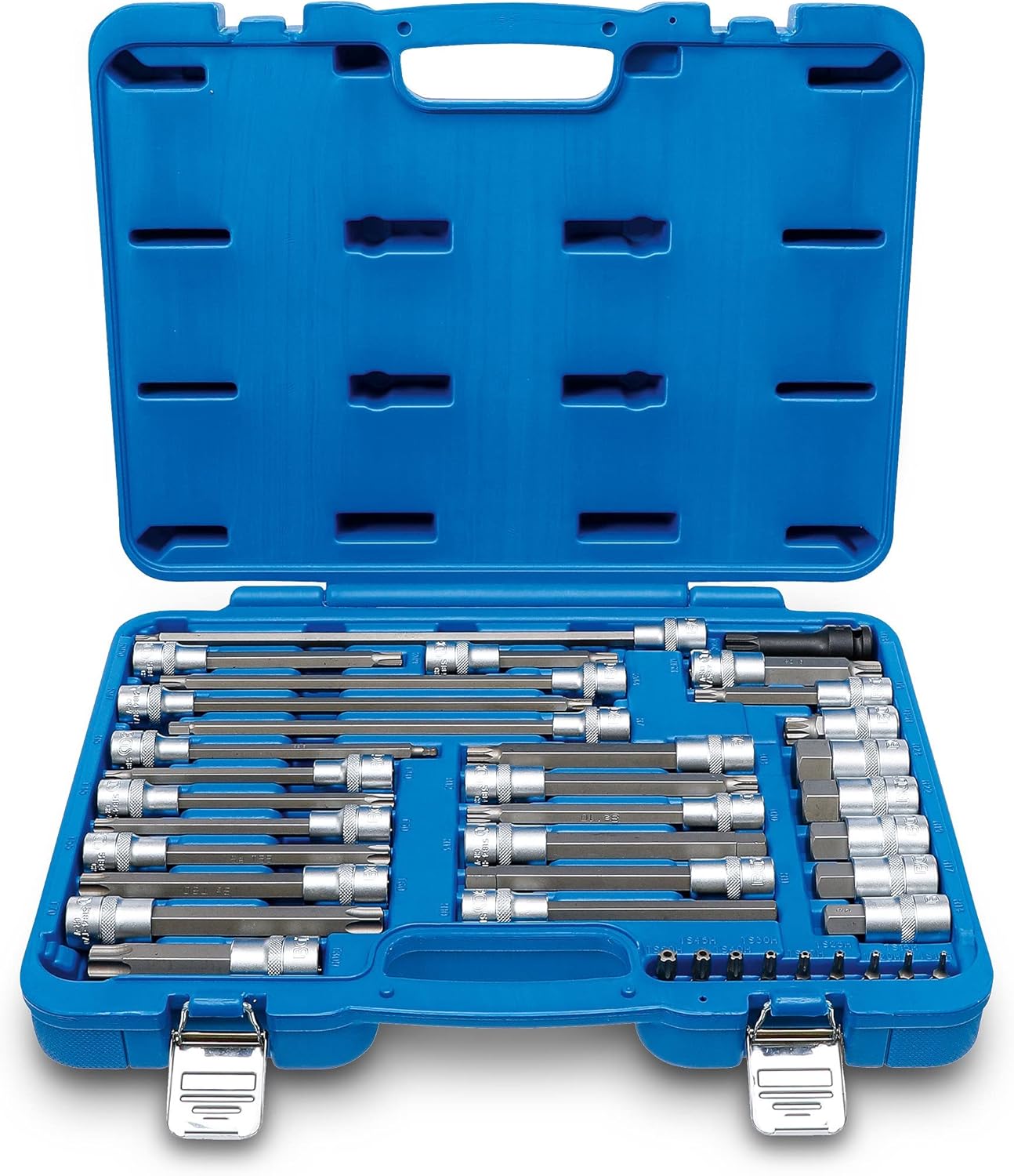 - 6 Bit-Einsätze, Antrieb Innenvierkant 12,5 mm (1/2"), Abtrieb T-Profil (für Torx): T40 - T45 - T50 - T55 - T60 - T70 (Länge 140 mm)