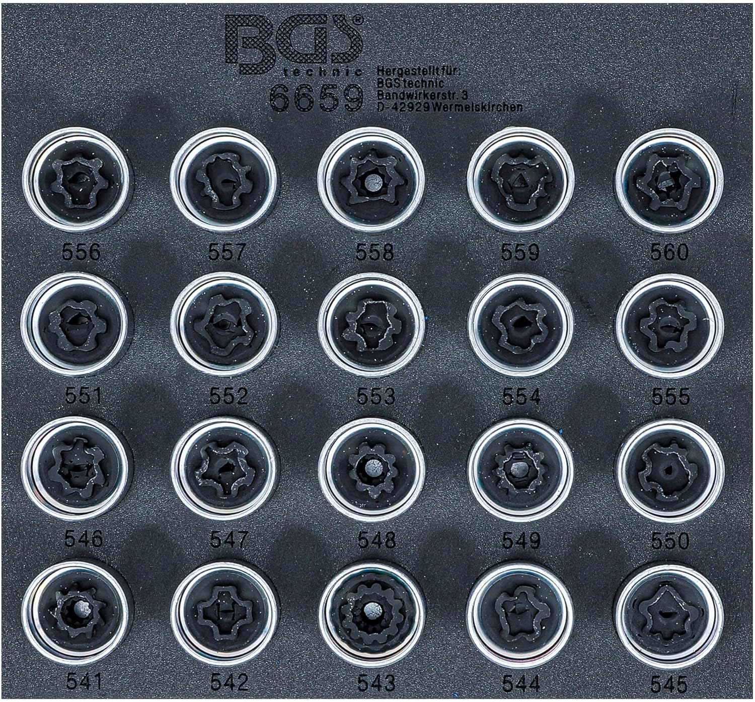 • 20 Felgenschlosseinsätze in den Grössen: #541, #542, #543, #544, #545, #546, #547, #548, #549, #550, #551, #552, #553, #554, #555, #556, #557, #558, #559, #560