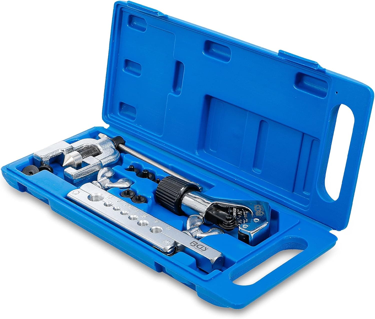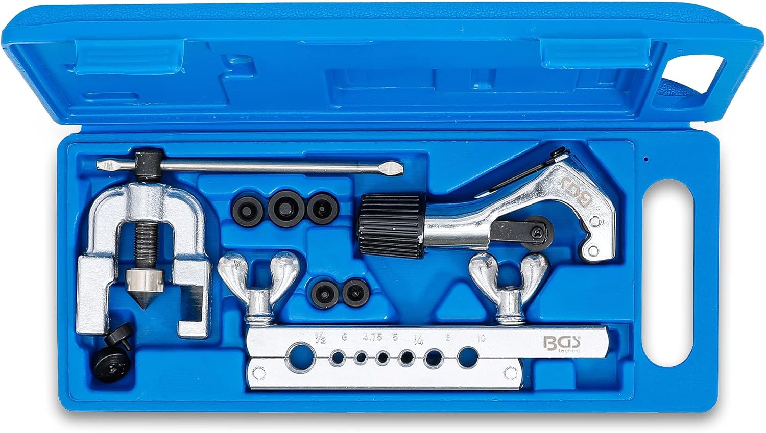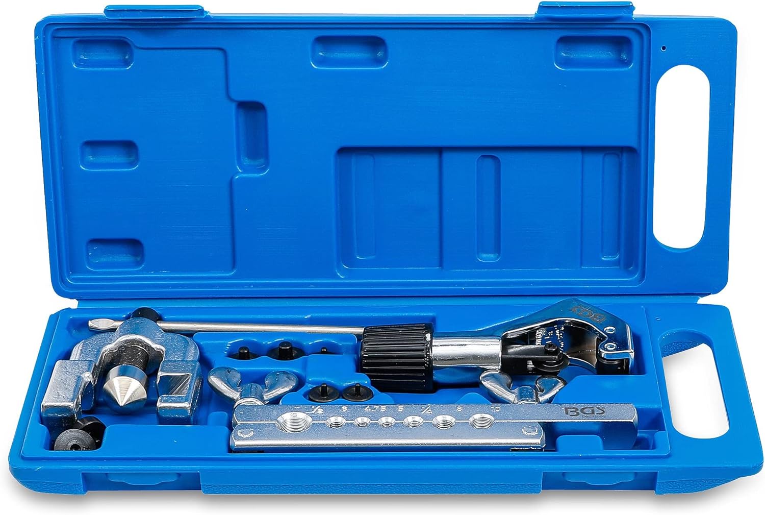 - Lieferumfang: 1 Grundgerät, 1 Haltebügel / Spannbacken, 1 Rohrschneider, 7 Druckstücke 1/4" - 1/2" - 4,75 - 5 - 6 - 8 - 10 mm