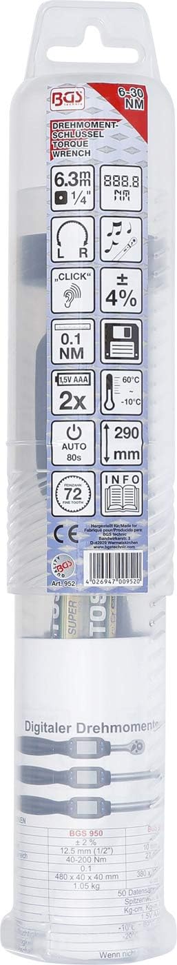 - digitale Anzeige | permanente Anzeige des gerade anliegenden Drehmoments | Automatische Abschaltung nach 80 Sekunden, wenn nicht in Gebrauch | Speicherkapazität: 50 Datensätze | Masseinheiten: kg-cm, kg-m, Ib-in, Ib-ft, N-m
