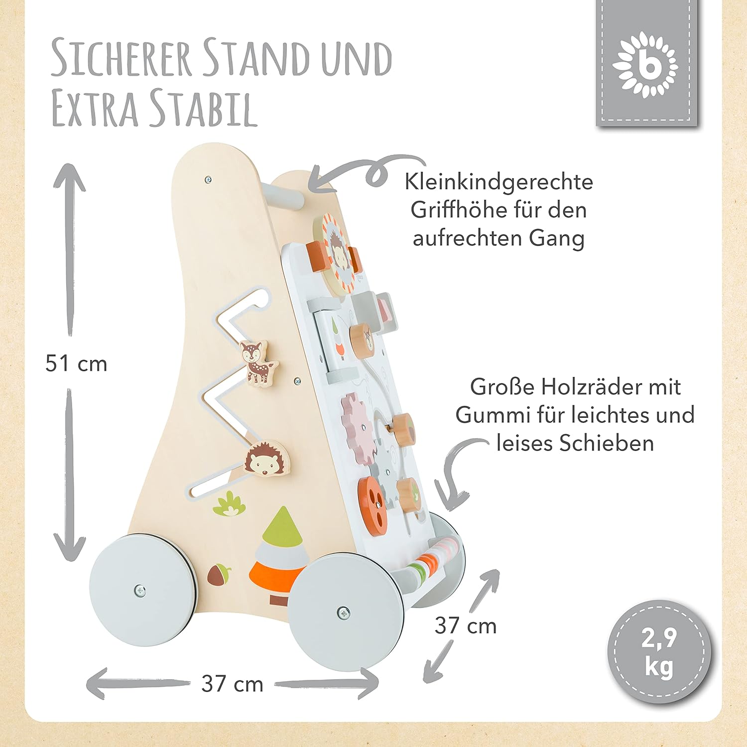- QUALITÄT & SICHERHEIT: Der Lauflernwagen ist aus hochwertigem Holz gefertigt und sorgfältig verarbeitet. Die 4 gummibereiften Räder lassen sich sanft rollen und sorgen für Stabilität