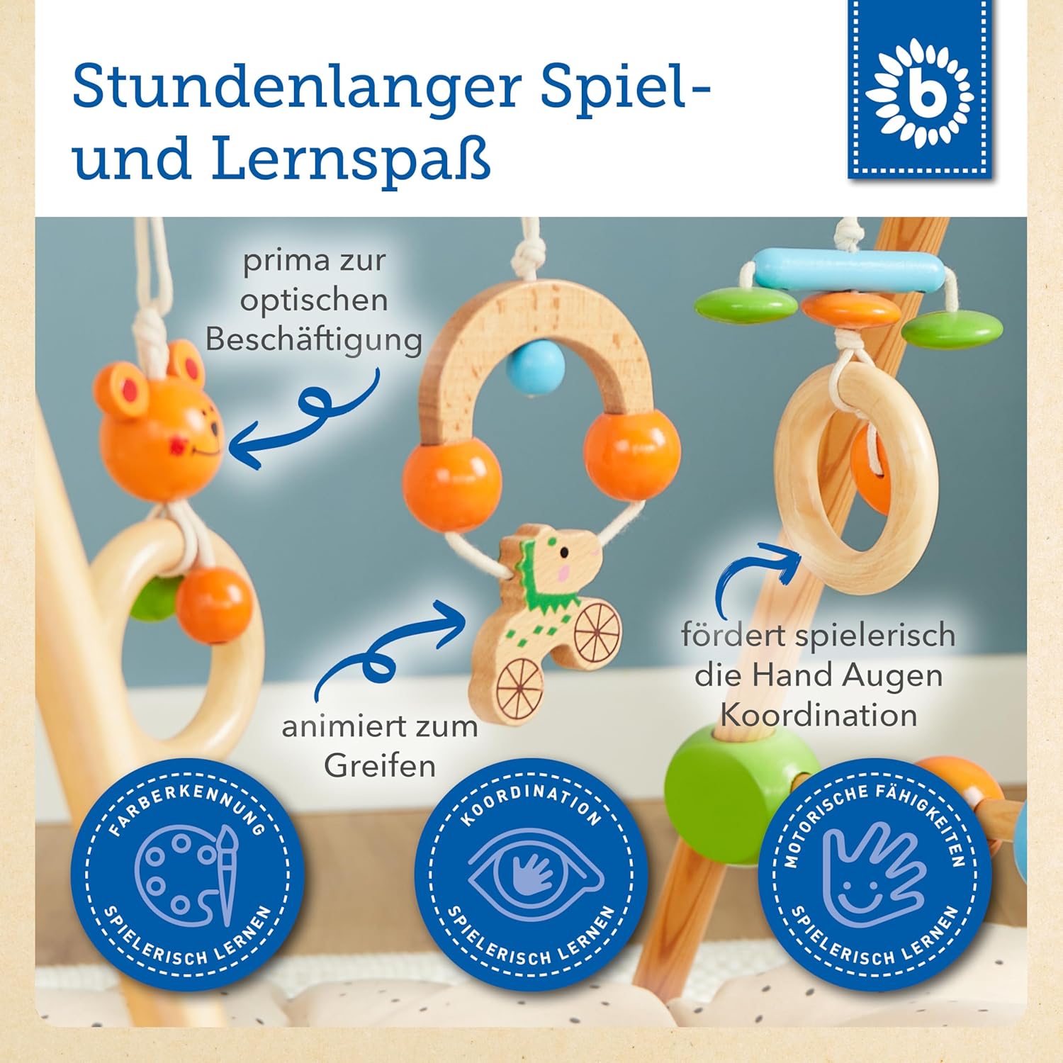 - TIPP: Der Baby Spielbogen Holz lässt sich perfekt mit einer Bieco Baby Krabbeldecke kombinieren. Als Geschenk verzaubert dieser schöne Spielbogen Baby Mädchen und Jungen