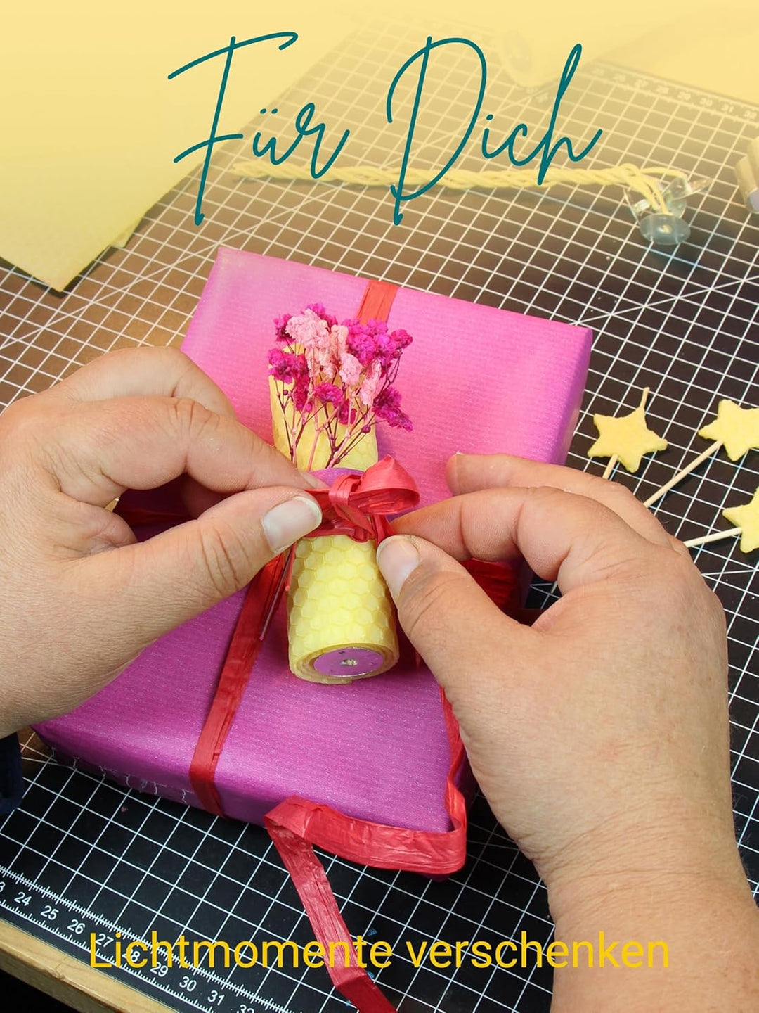 - 🕯️ INHALT – 10 gelbe Bienenwachsplatten für Kerzen (6 Stück 20 × 15 cm und 4 Stück 20 x 10 cm), 10 Hanfdochte 21 cm mit Metallfuss, 3 Ausstechförmchen (Stern, Mond und Herz), 2 m Raffia-Band rot, Anleitung – Kerzenset komplett für 10