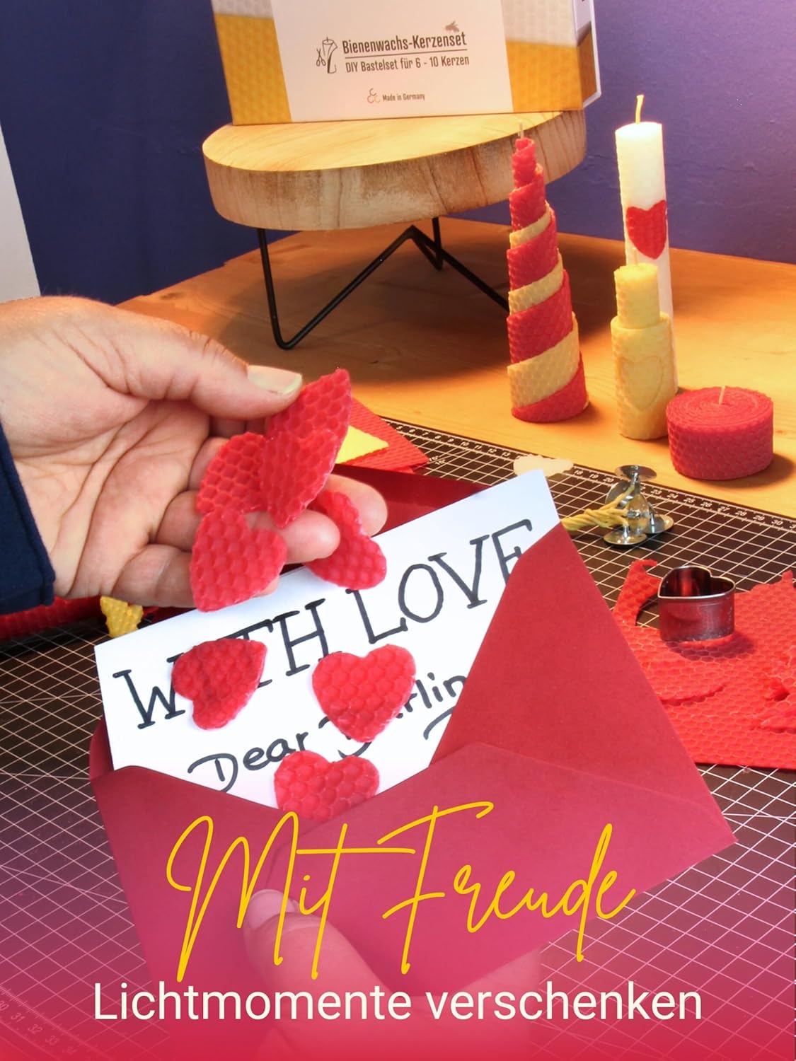 - 🕯️ GENAUER INHALT – 10 Bienenwachsplatten für Kerzen 20 x 15 cm gross (4 x gelb, 4 x rot, 2 x weiss), 10 Hanfdochte 21 cm Länge mit Metallfuss, 3 Ausstechförmchen (Herz, Blume, Schmetterling), 2 m Raffia-Band rot, Anleitung – alles für 10