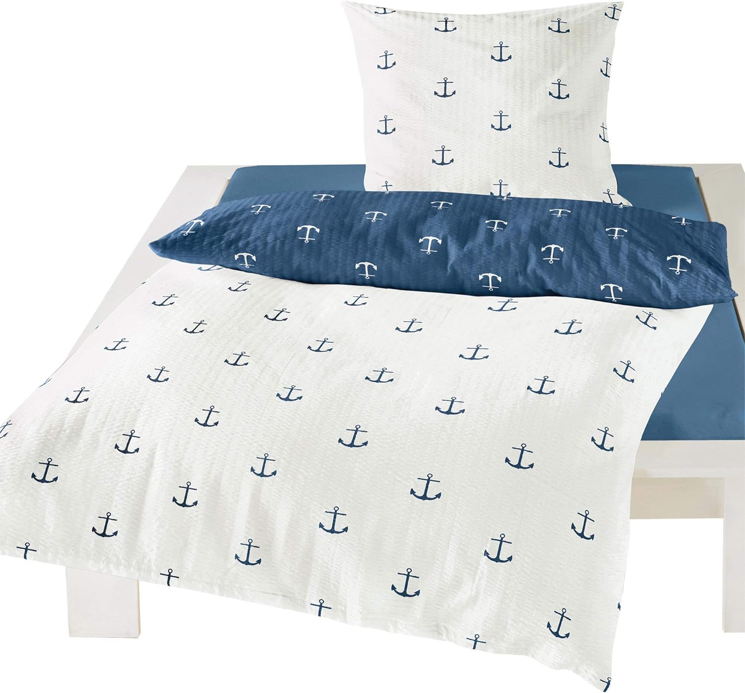 • Kissenbezug beidseitig Fond natur mit blauem Ankermotiv Bettbezug in Wendeoptik, eine Seite natur, andere Seite blau, je mit Ankermotiv