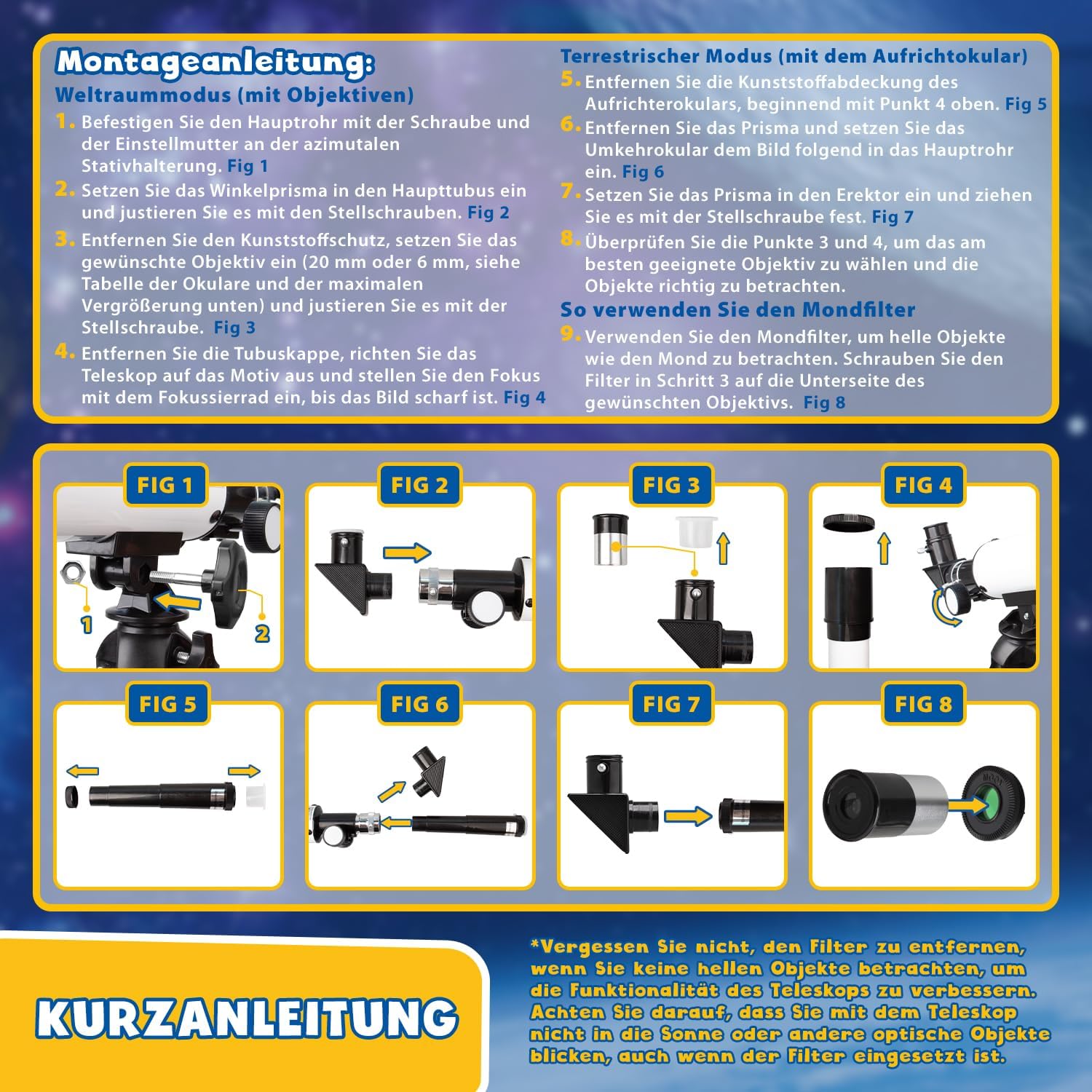 - 👍 EINFACH ZU BENUTZEN 👍 Das Design dieses teleskop kinder ist so konzipiert, dass es einfach zu benutzen und zusammenzubauen ist. Nach dem zusammenbau kann das terrestrische und telescope astronomy um 180° vertikal und 360° horizontal verstellt