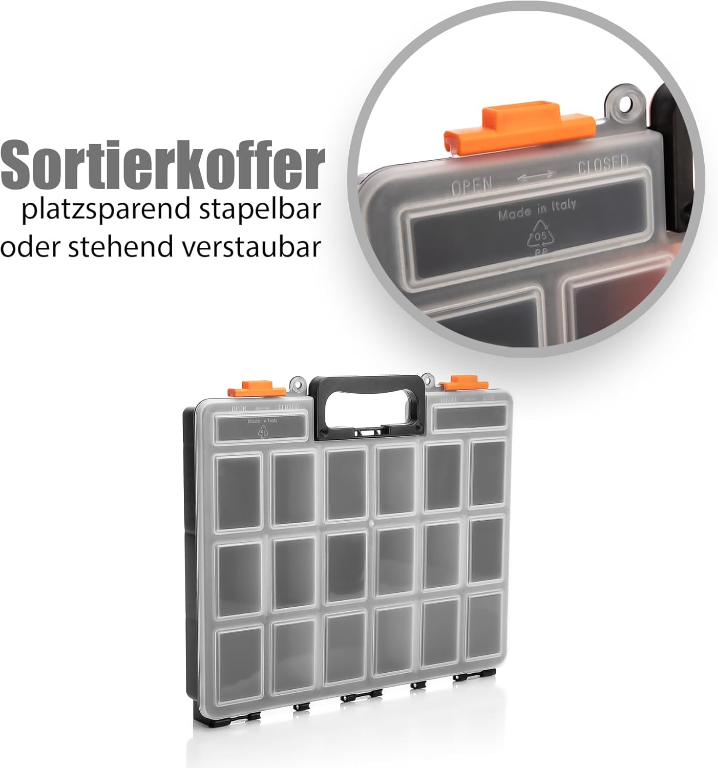- ROBUST & LANGLEBIG – MADE IN ITALY: Hergestellt in Italien, steht unser Produkt für Qualität und Zuverlässigkeit. Setzen Sie auf ein Produkt, dem Sie vertrauen können. Unser Sortimentskoffer wird aus bruchsicherem & hochwertigem Kunststoff