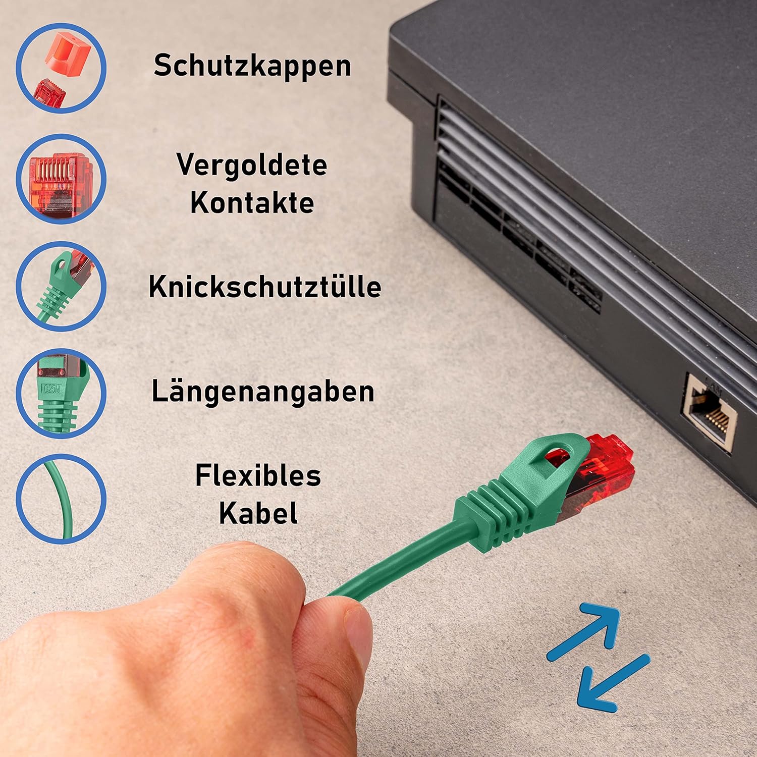 - Ethernet-Kabel Netzwerkkabel - 2 x RJ45-Stecker LAN Stecker , vergoldete Kontaktflächen , mit angespritzter robuster Knickschutztülle - Knickschutz , hochwertiger Innenleiter , Längenangabe am Stecker