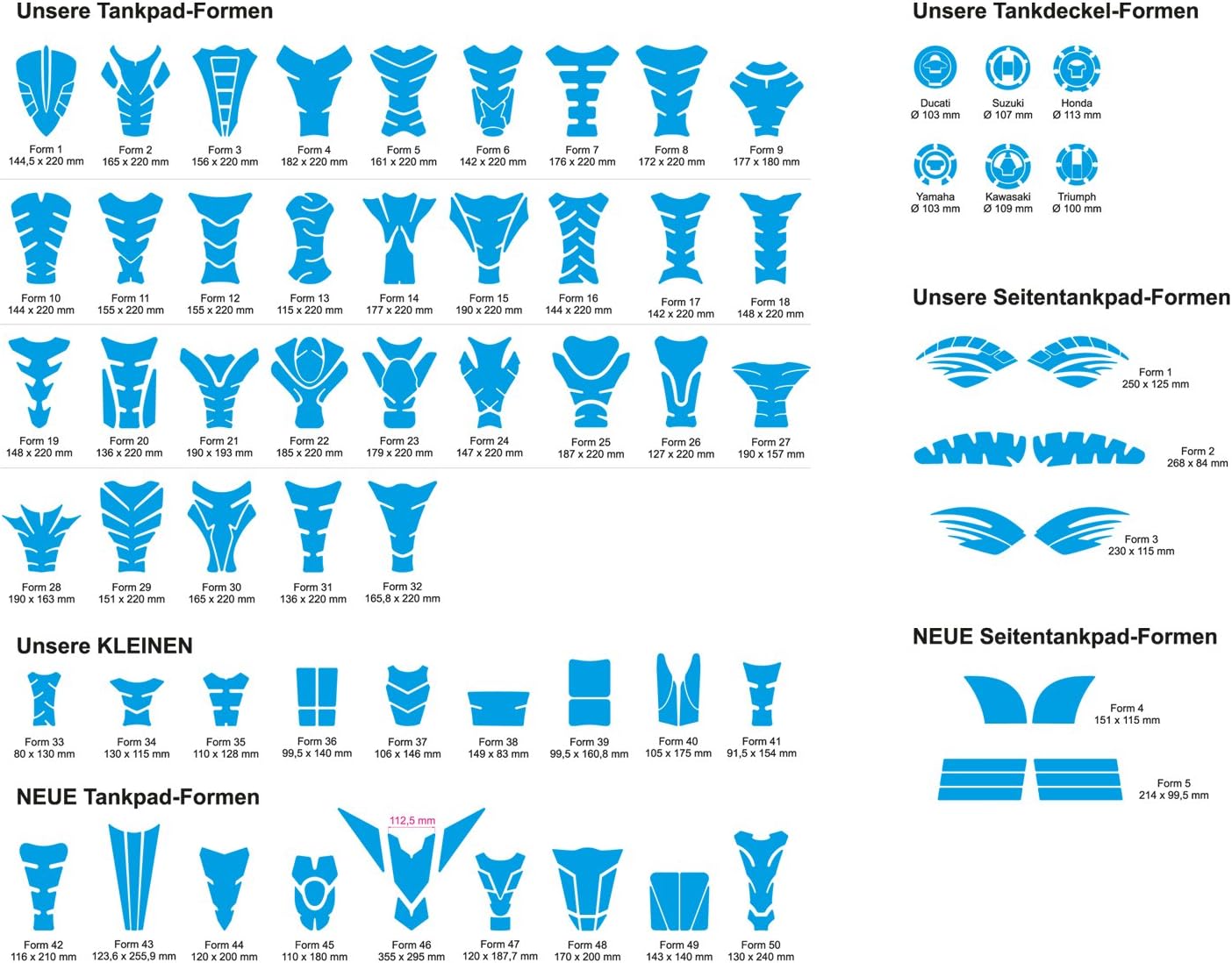 • Grösse: je Seite ca 268 x 84 mm (Set für linke und rechte Tank Seite) Materialstärke: ca. 1 - 2 mm (bezogen auf die Anordnung wie im Bild)
