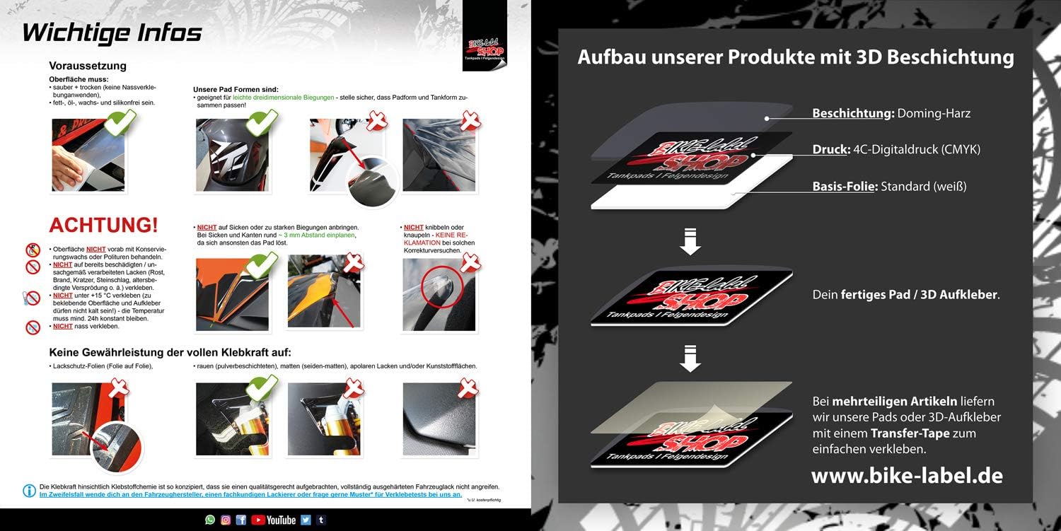 • Aufkleber und Sticker von BIKE-label bestehen aus einer selbstklebenden Folie mit einer kristallklaren dreidimensionalen Doming-Gel Beschichtung und werden z.T. mit einem Übertragungstape geliefert