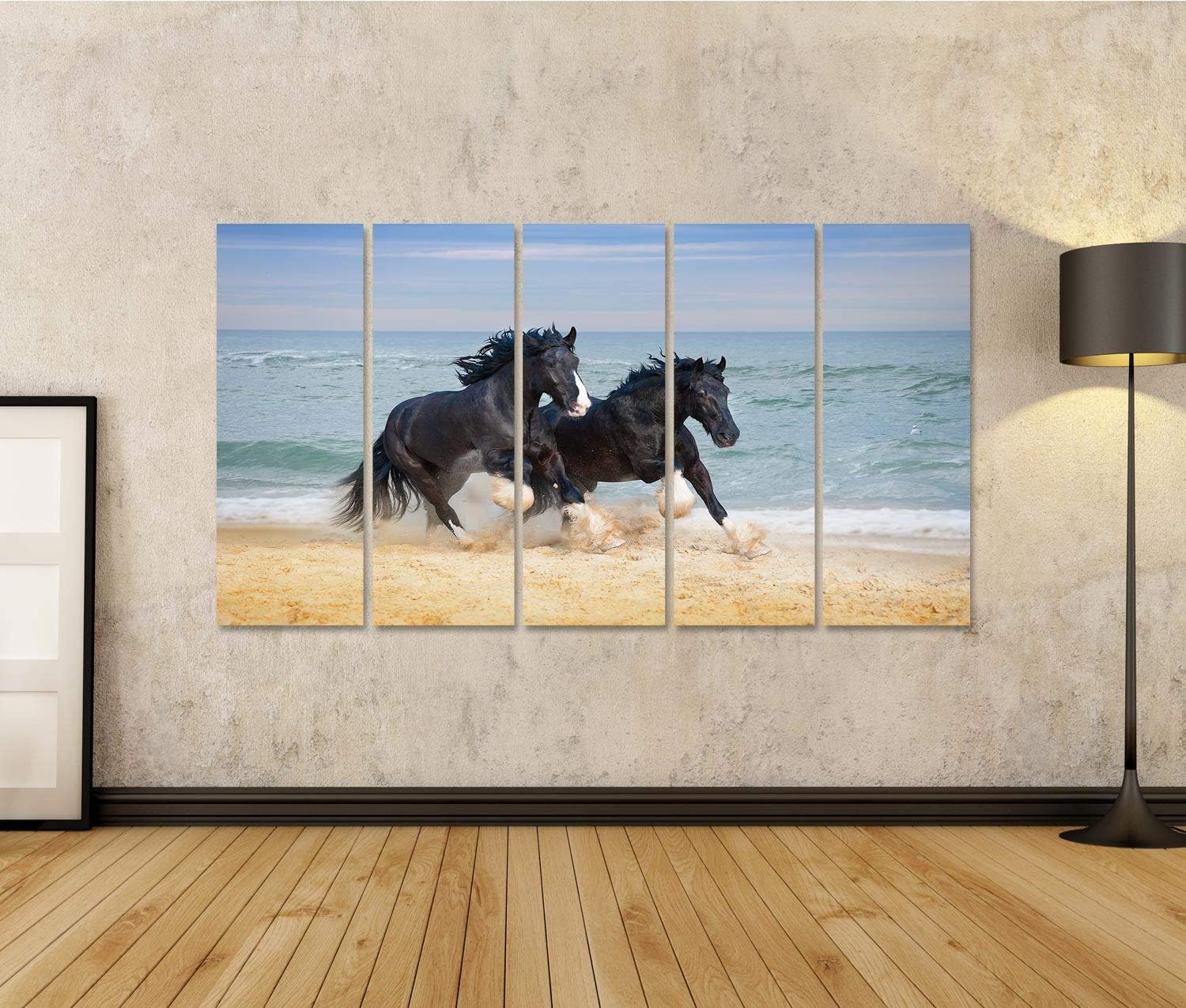 Bild Bilder auf Leinwand Zwei schöne grosse Pferde züchten Grafschaftgalopp entlang dem Strand, der