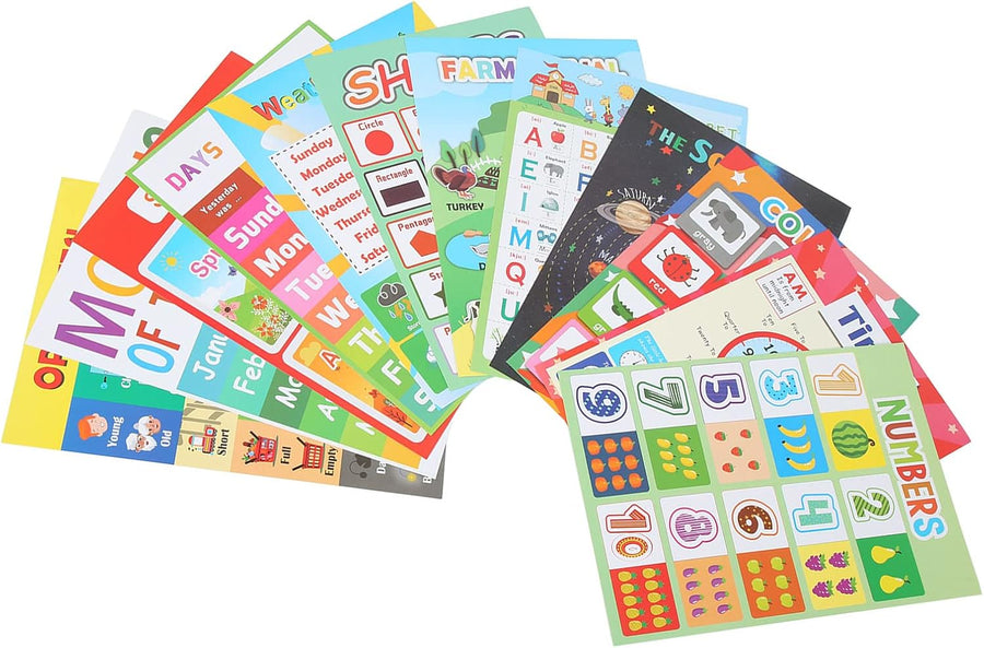 - 12 verschiedene Wandposter: Tiere, Wetterkarten, Monate, entgegengesetzte Wörter, Farben, Zeit, Formen, Buchstaben, Jahreszeiten, Wochentage, Sonnensystem, Zahlen.