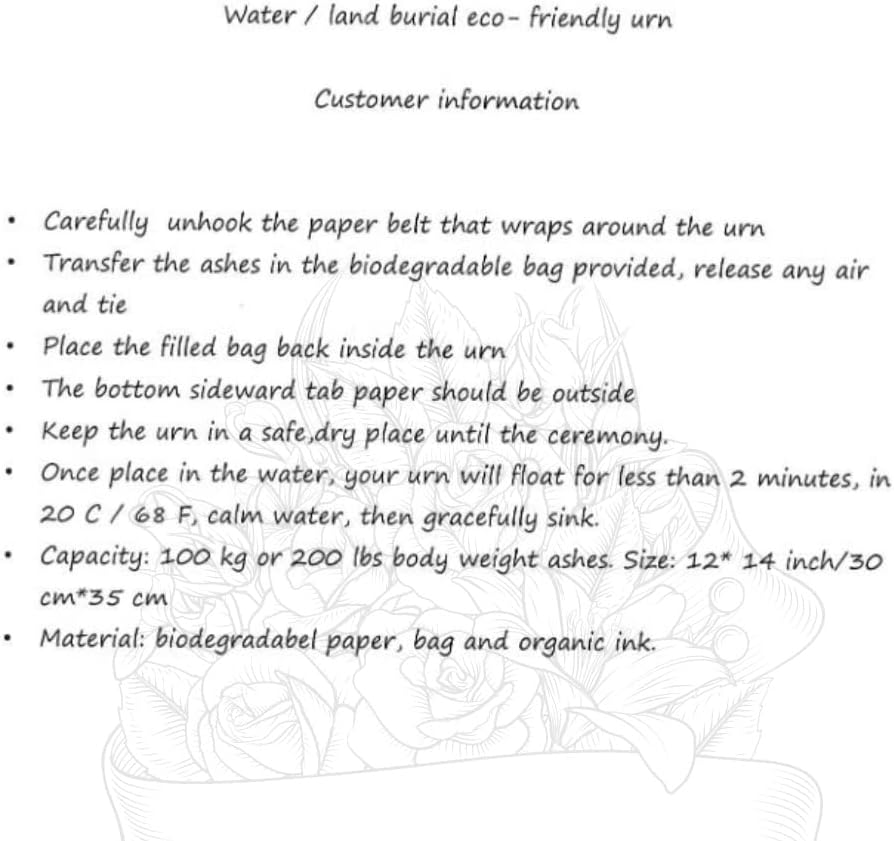 - Diese Urne ist für die Wasserbestattung konzipiert, kann aber auch für die Landbestattung verwendet werden. Einmal in Wasser gelegt, schwimmen diese Urnen kurz, bevor sie anmutig auf das Wasserbett sinken.