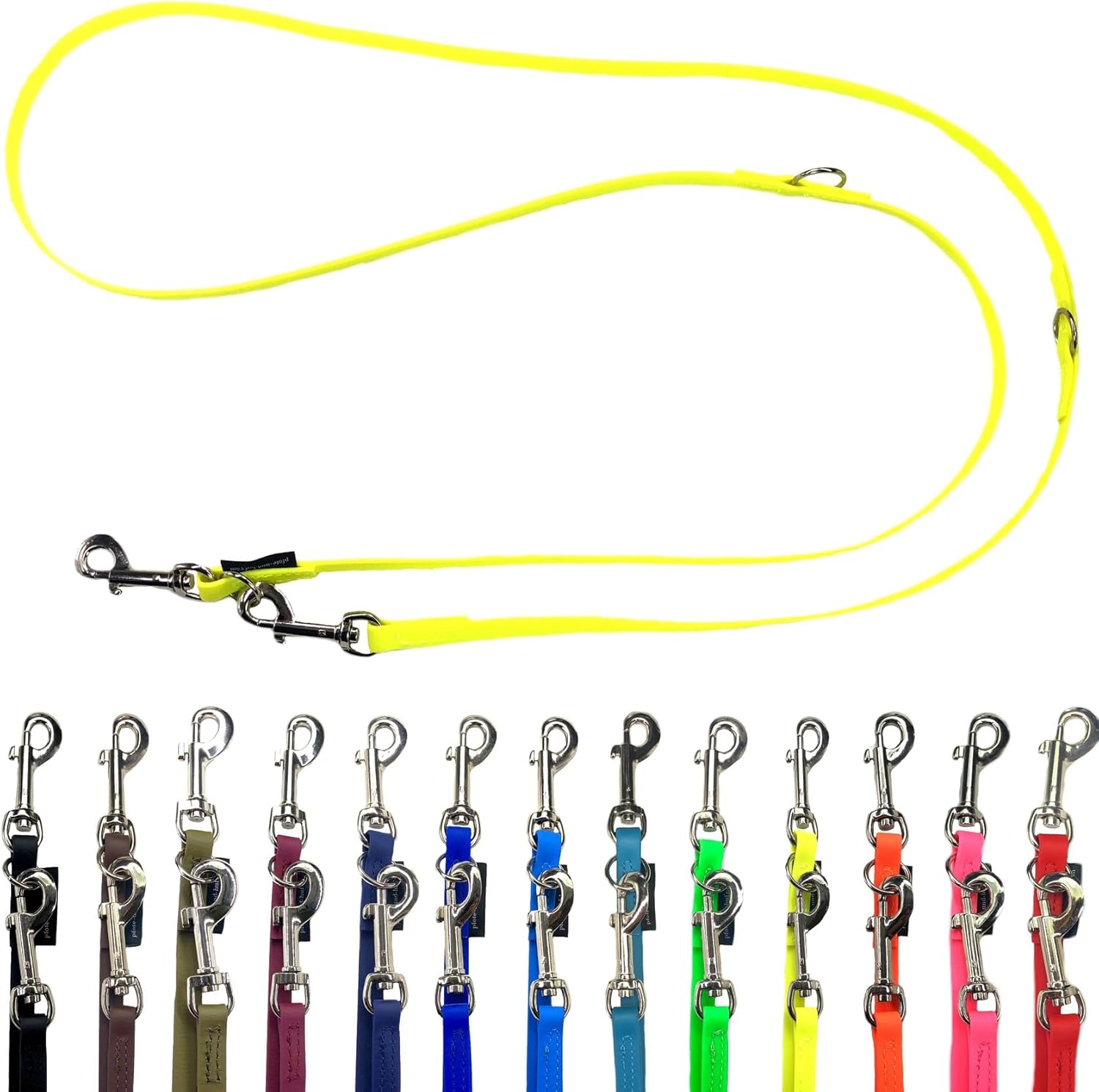 - Diese Leine gibt es in 12 verschiedenen Farben und in 5 verschiedenen Längen. Die Längen 2,00m und 2,40m sind 3-fach verstellbar, die 2,80m und 3,50m sind 4-fach verstellbar und die 5,00m Leine ist 5-fach verstellbar.