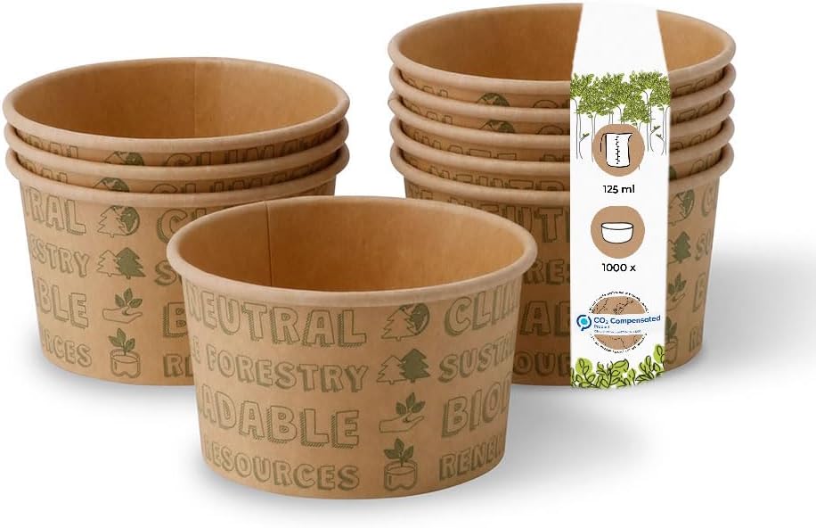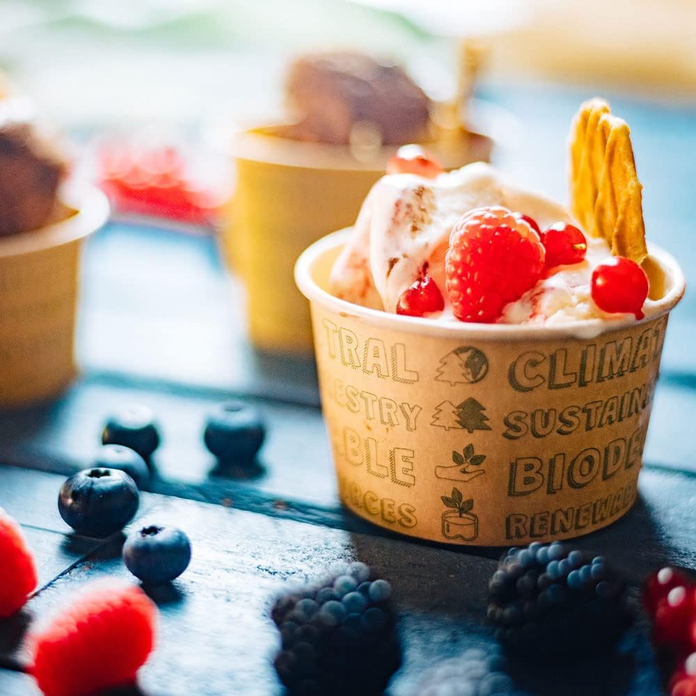 - NACHHALTIG - Papp-Eisbecher aus ungebleichtem Kraftkarton aus zertifiziert nachhaltiger Forstwirtschaft mit einer wasserbasierten Lackbeschichtung - frei von erdölbasiertem Kunststoff, kompostierbar & recycelbar