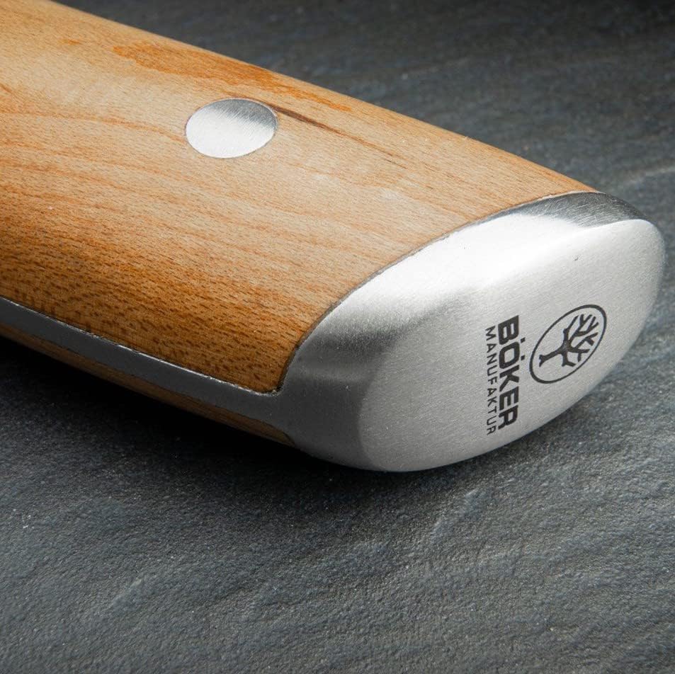 - Die Griffschalen aus hochwertigem Ahornholz werden klassisch mit drei Edelstahlnieten dauerhaft und ohne Fugen mit dem vollständig durchgehendem Messererl verbunden.