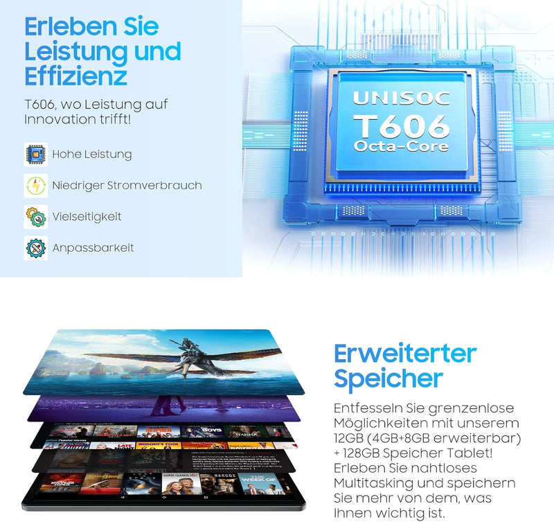 - 12GB (4+8 Erweiterung) RAM + 128GB Speicher & 5G WiFi + Bluetooth 5.0:Dieses Android Tablet mit einem 11-Zoll-Bildschirm verfügt über 12GB RAM, bestehend aus 4GB Basisspeicher und 8GB erweiterbarem virtuellem Speicher, der durch das eigens