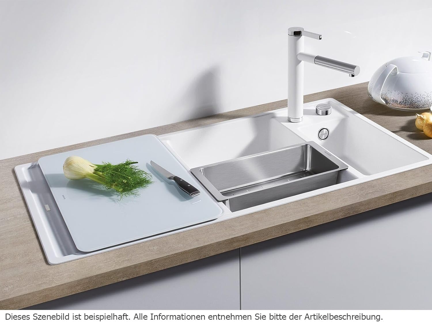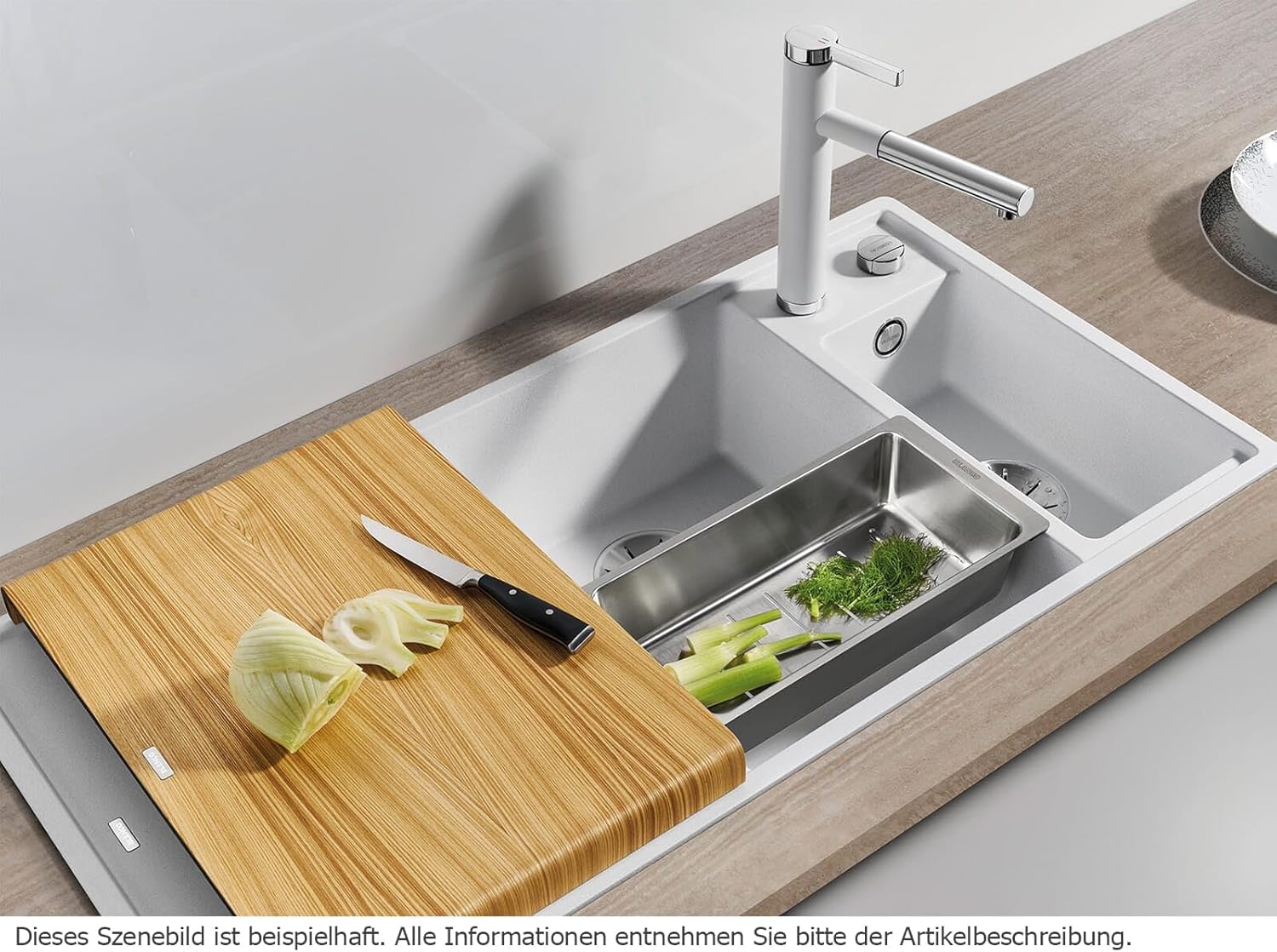 - Durchdacht bis ins Detail: mit verschiebbarem Schneidbrett, umhängbarer Multifunktionsschale, Ablaufsystem InFino, Ablauffernbedienung, elegant integriertem Überlauf und engen Radien für komfortable Nutzung