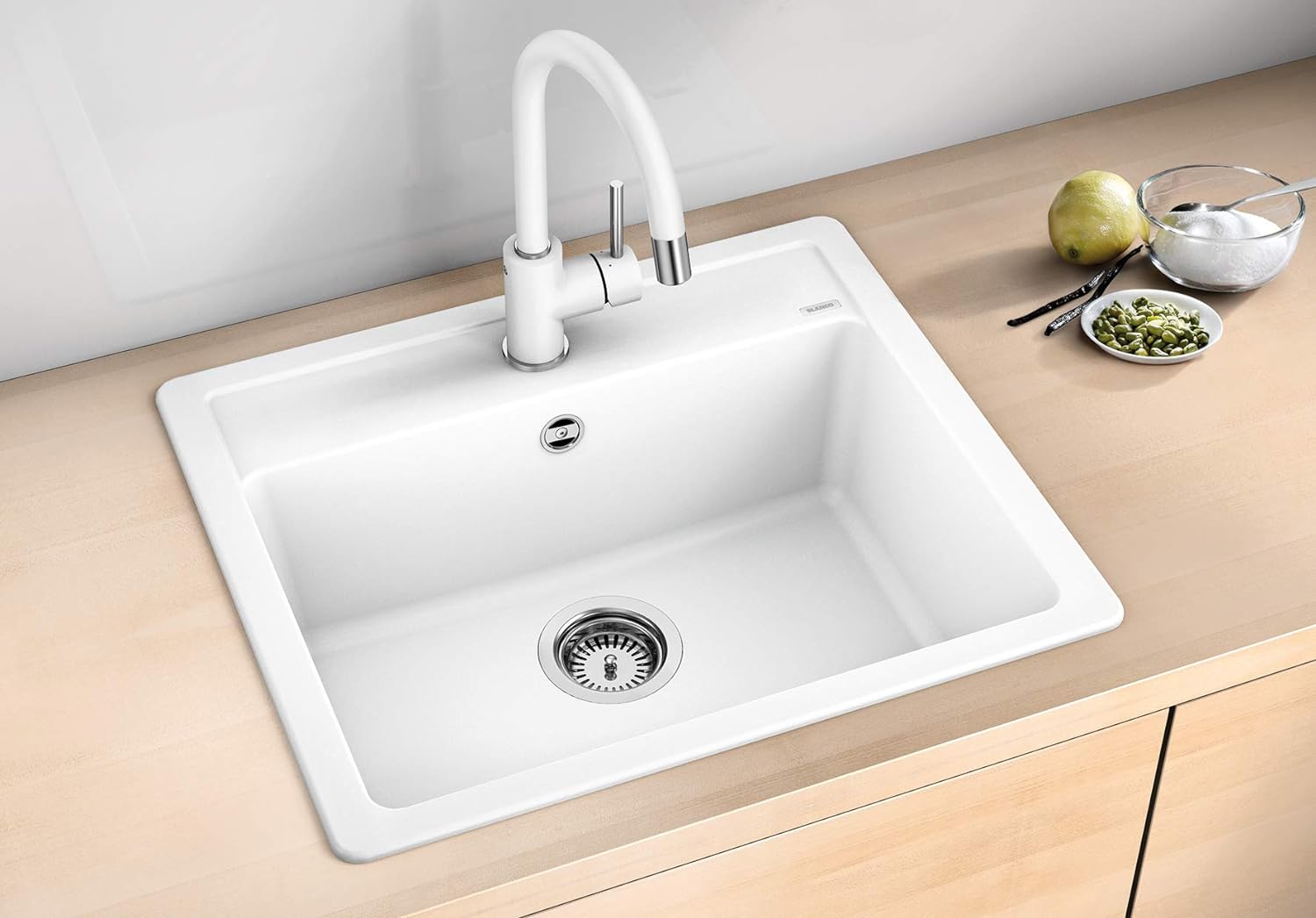 • Rechteckige Einbauspüle in klassischer Linienführung: Spülbecken in weiss für 60 cm breite Unterschränke – in weiteren SILGRANIT-Farben erhältlich und farblich auf die passenden BLANCO Armaturen abstimmbar